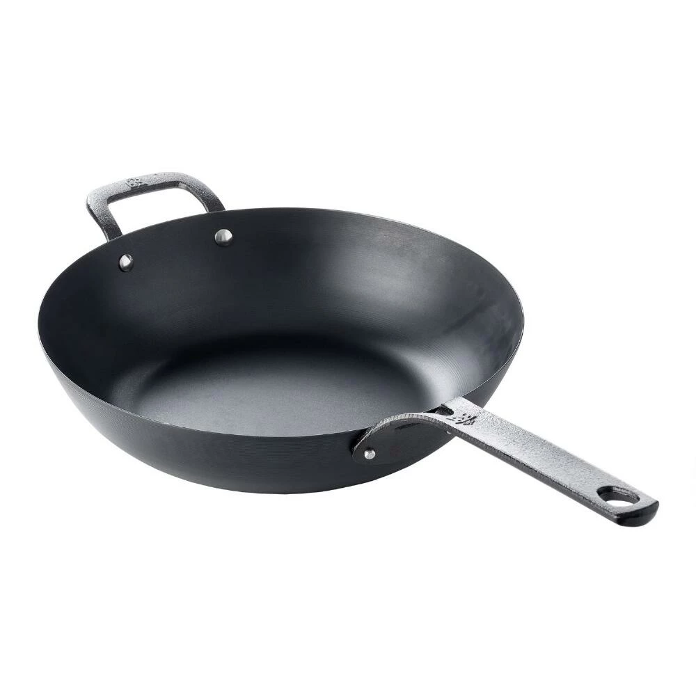 - Crafted of hot-rolled black carbon steel with iron-oxide finish and riveted cast-iron and stainless steel handles
