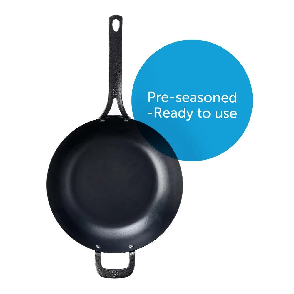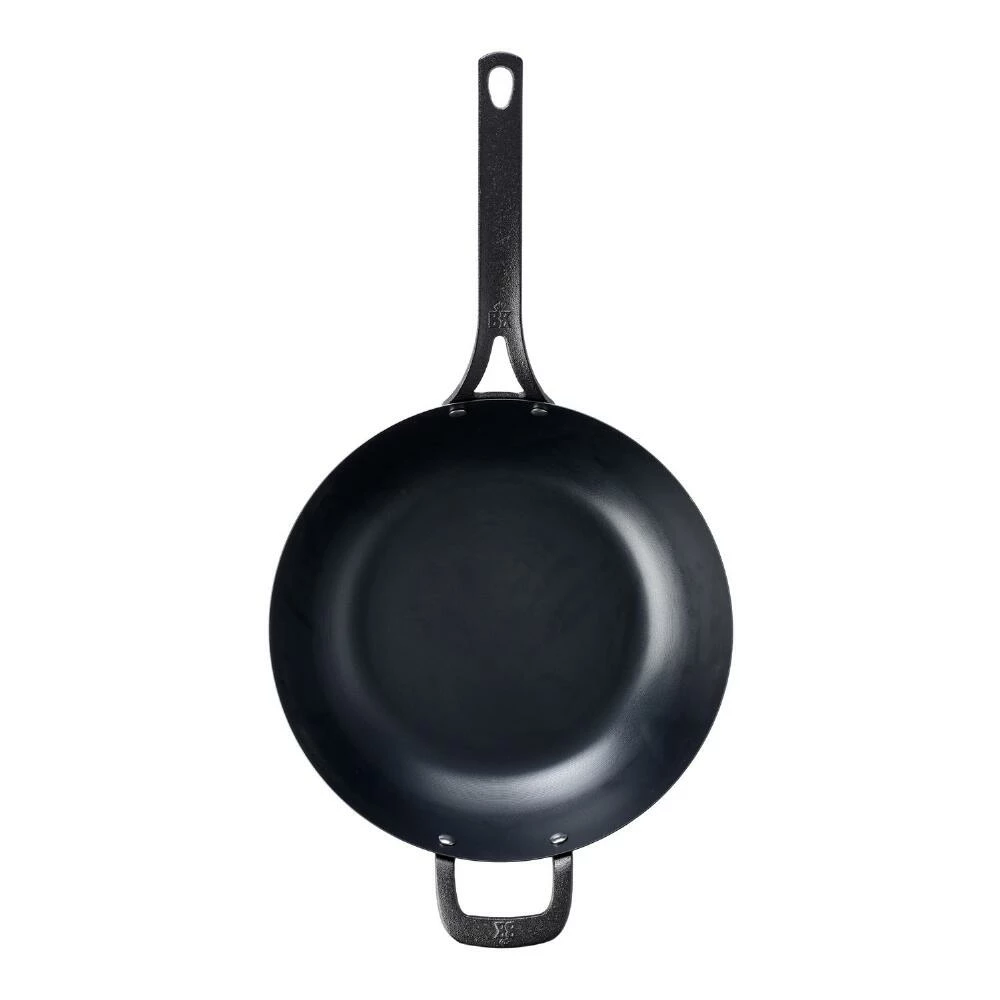 Stir-fry, sauté and simmer to perfection with this hot-rolled black carbon steel wok with two riveted cast-iron handles. A favorite of chefs, black steel offers the fast, even heating and superior durability of cast iron in a lighter, more responsive construction. A lasting kitchen gift, this reliable wok’s surface grows darker with every use, forming a patina that improves its resistance to corrosion and stains and allows for easier release.
