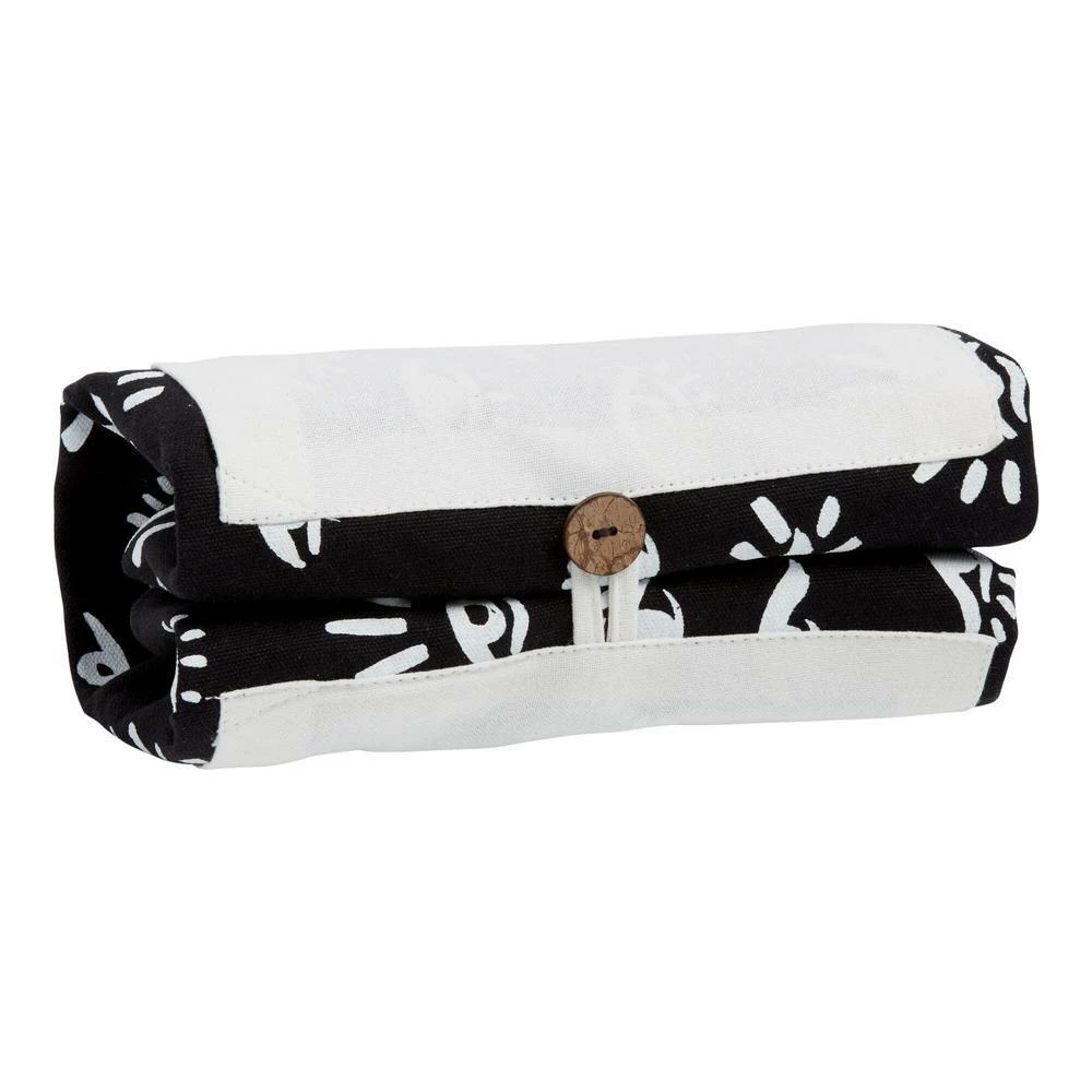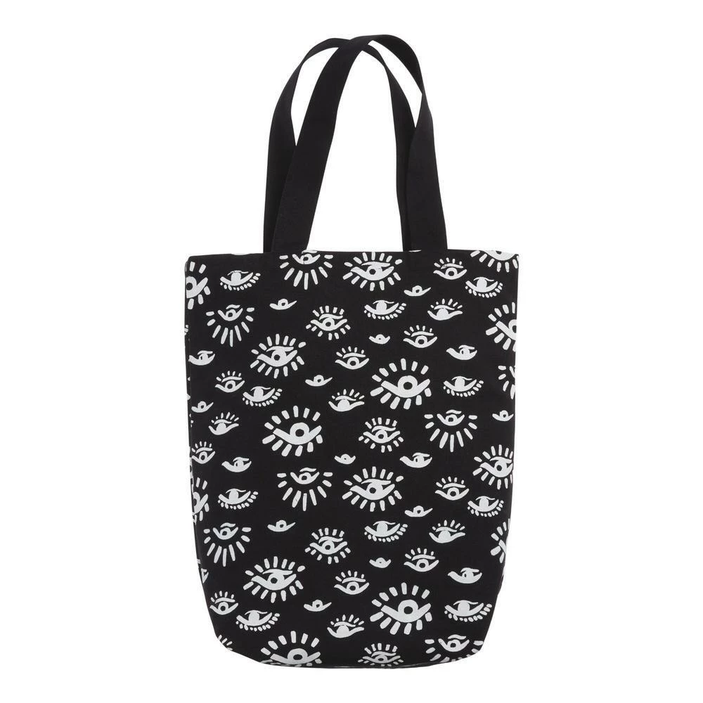 Our exclusive, space-saving tote bag brings a worldly touch to any activity or adventure and conveniently rolls up when not in use. Crafted in India of 100% cotton, it’s outfitted with a beige front pocket with gold accents and a black and white evil-eye print. The evil eye is an ancient symbol believed to be a powerful protector against misfortune.