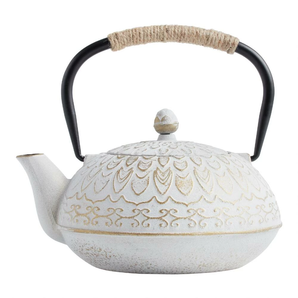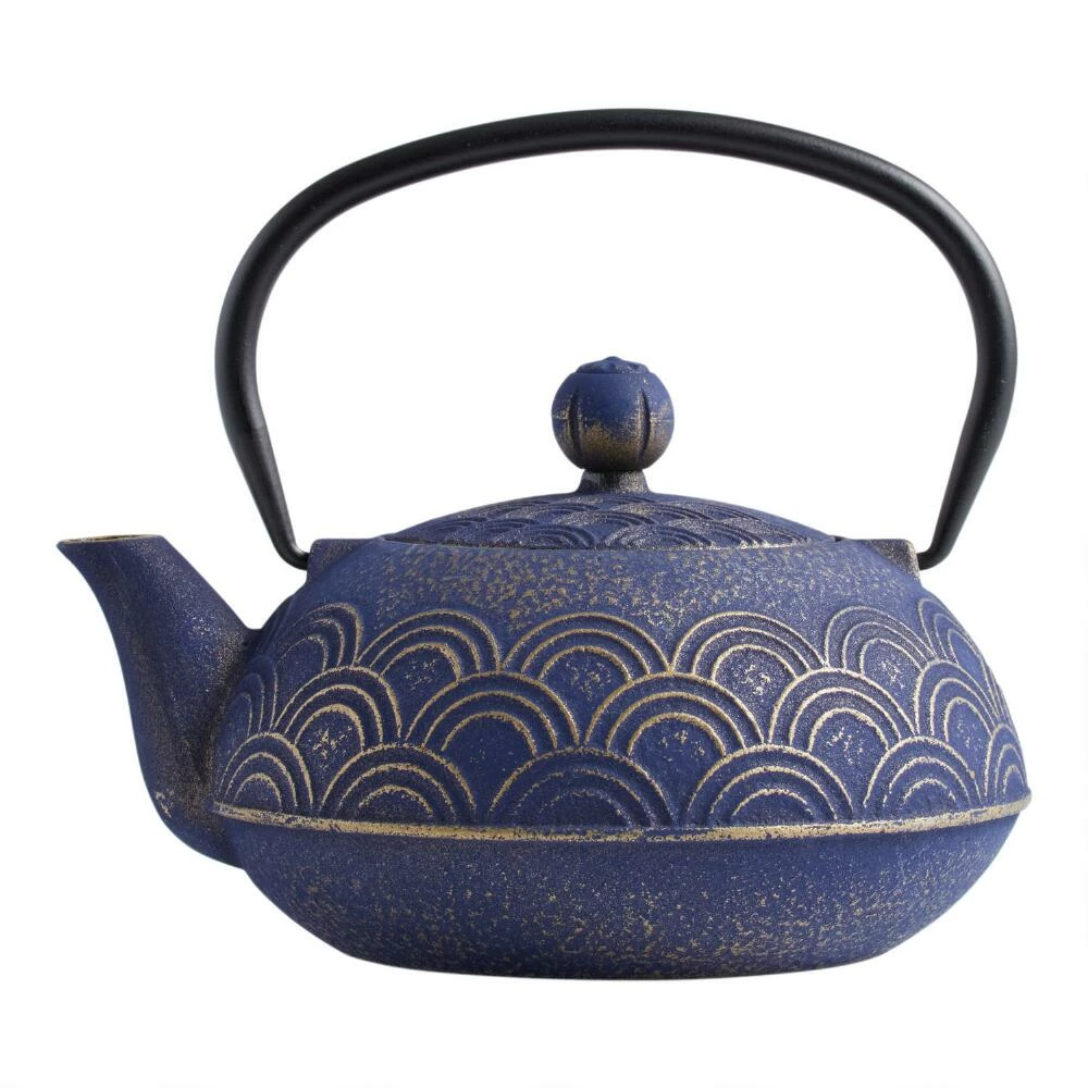 Our exclusive teapot is crafted of durable cast iron in distressed indigo blue or white, each with gold details. The enamel interior prevents rust and a removable stainless-steel infuser keeps loose leaf teas contained while steeping. With a textured embossed pattern and swing handle plus a drip-free pouring spout, this vintage-inspired tea brewer is a useful decorative gift for entertaining.