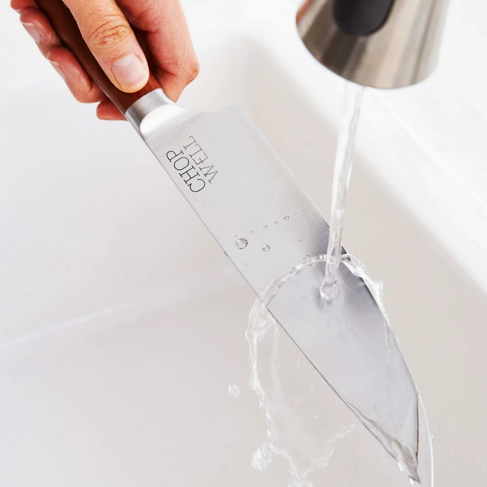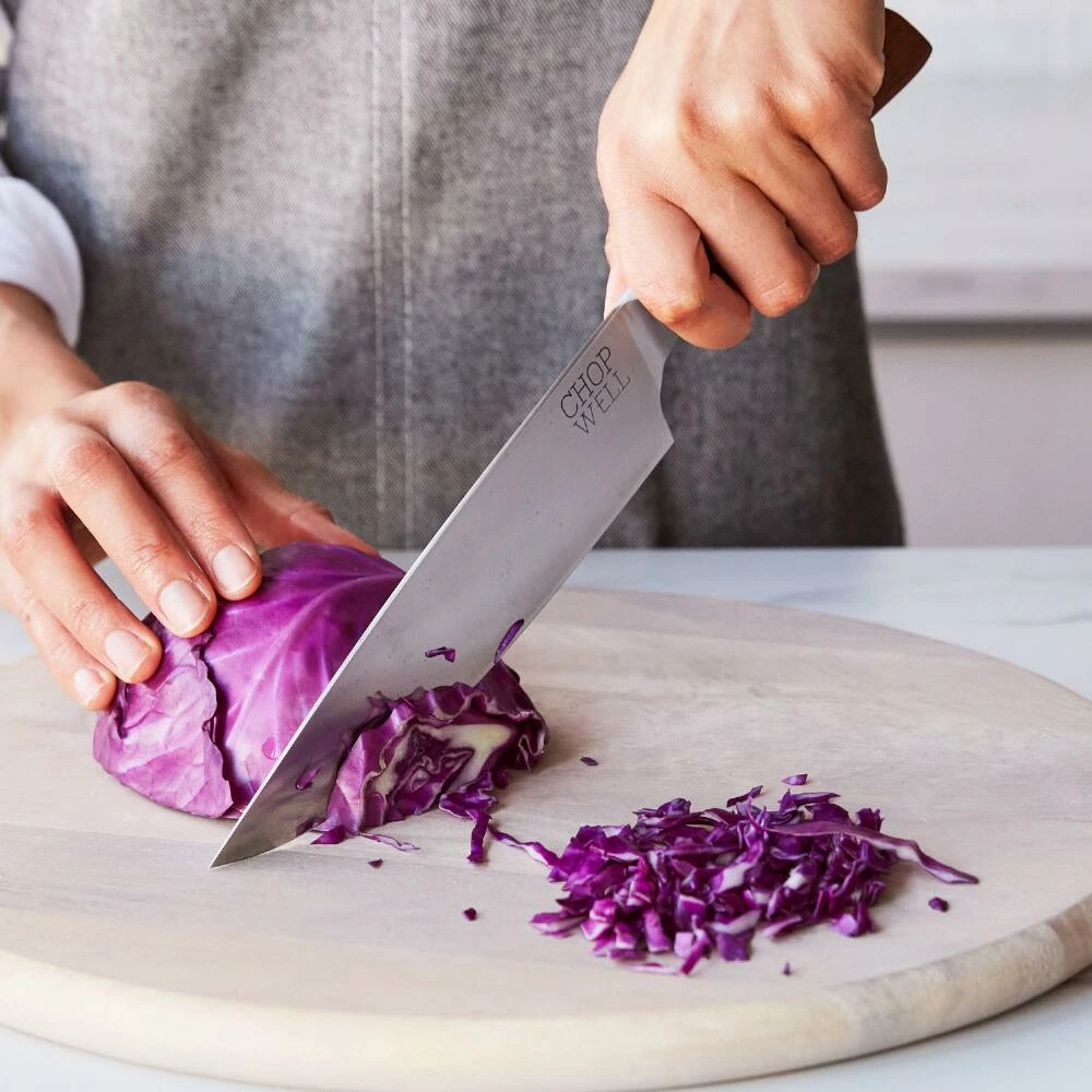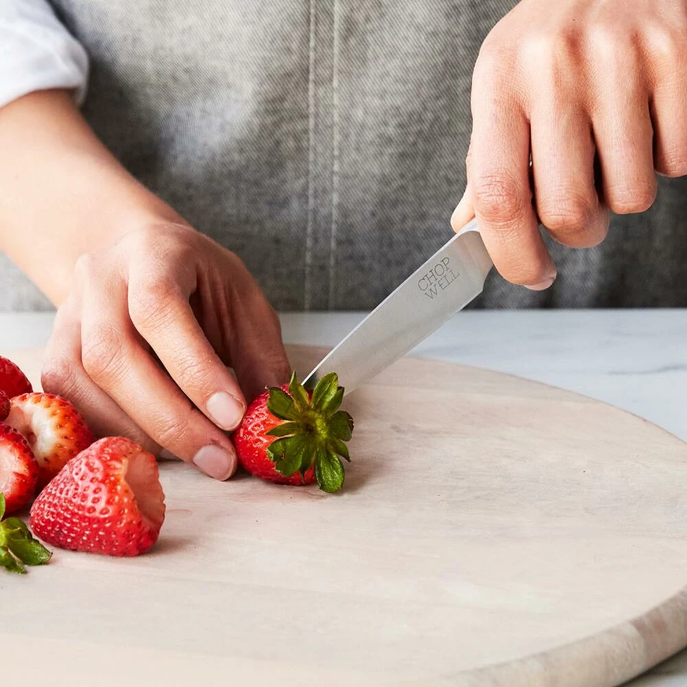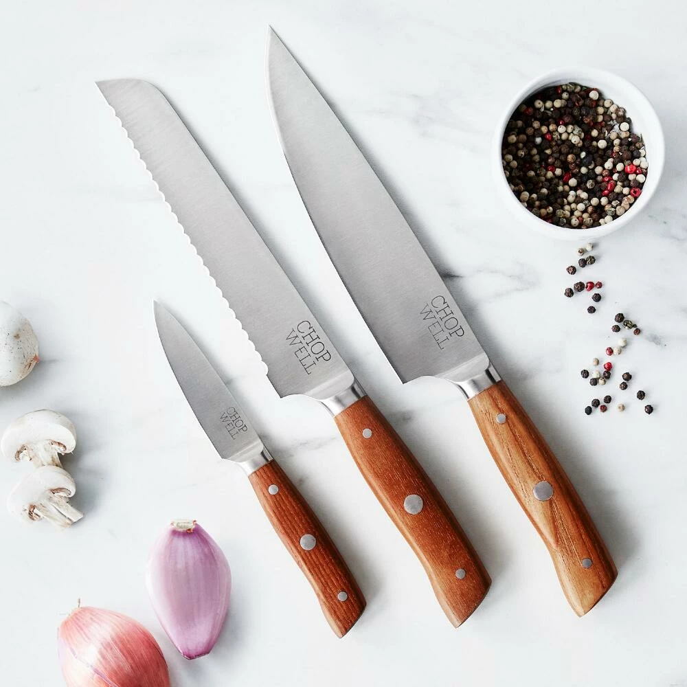 Our Chopwell starter-knife set includes a paring knife, serrated bread knife and chef’s knife with durable carbon-steel blades and carbonized ash-wood handles. Each rich wooden handle is sustainably sourced, ergonomic and triple-riveted for strength. Attractive, balanced and sharp, these chef-quality prep knives are an excellent gift for new kitchens and a fine replacement for worn-out cutlery.
