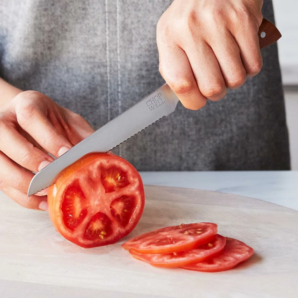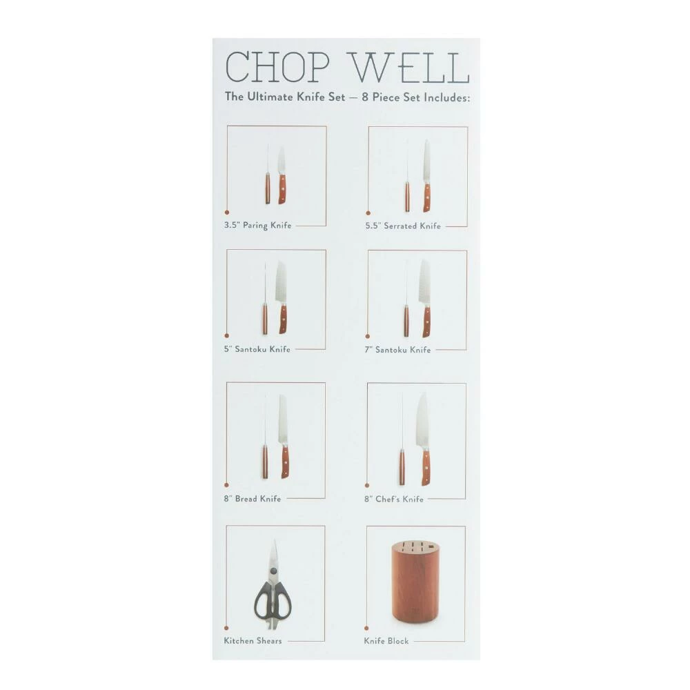 - 8-Piece includes paring, utility, five-inch santoku, seven-inch santoku, bread and chef’s knives, kitchen shears and knife block