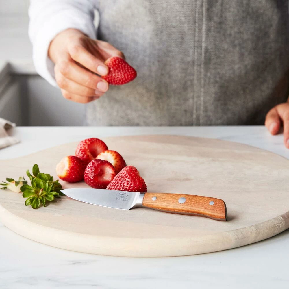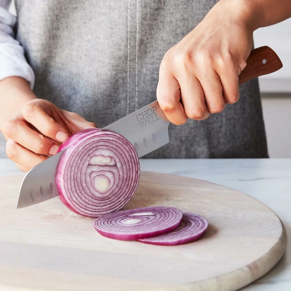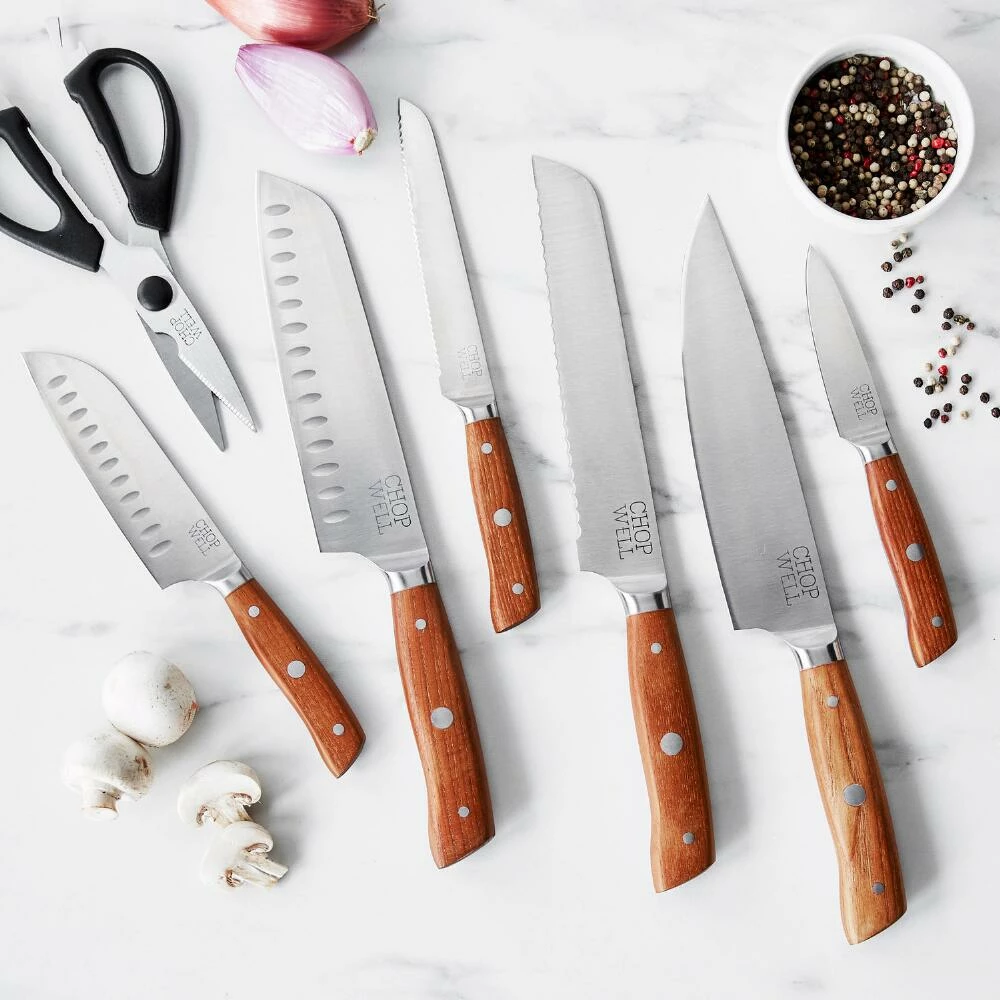 Our exclusive Chopwell cutlery gift set presents six sharp and durable carbon-steel knives and a pair of shears in a carbonized ash-wood knife block. A chef-quality prep knife set, it includes paring, utility, bread, five-inch santoku, seven-inch santoku and chef’s knives along with food-safe utility scissors. The cylindrical knife block saves counter space in small kitchens and its rich ash wood construction matches the riveted knife handles.