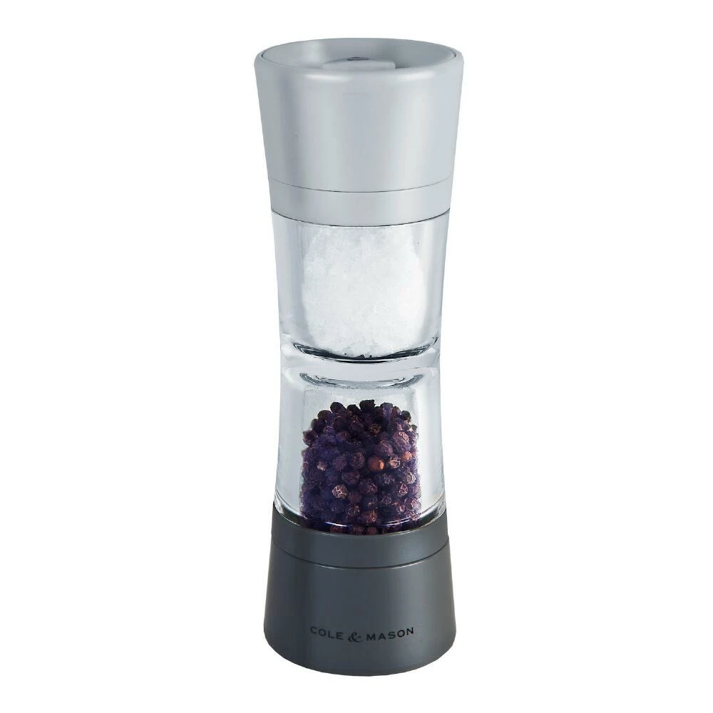 A space-saving spice mill, the Cole & Mason Lincoln prefilled dual grinder is ideal for small kitchens and innovative cooks. Simply turn it one way for pepper, the other for salt and adjust the grind from fine to coarse. This handy chef’s tool features clear windows to indicate when it’s time to refill and its color-coded ends look great on any tabletop.
