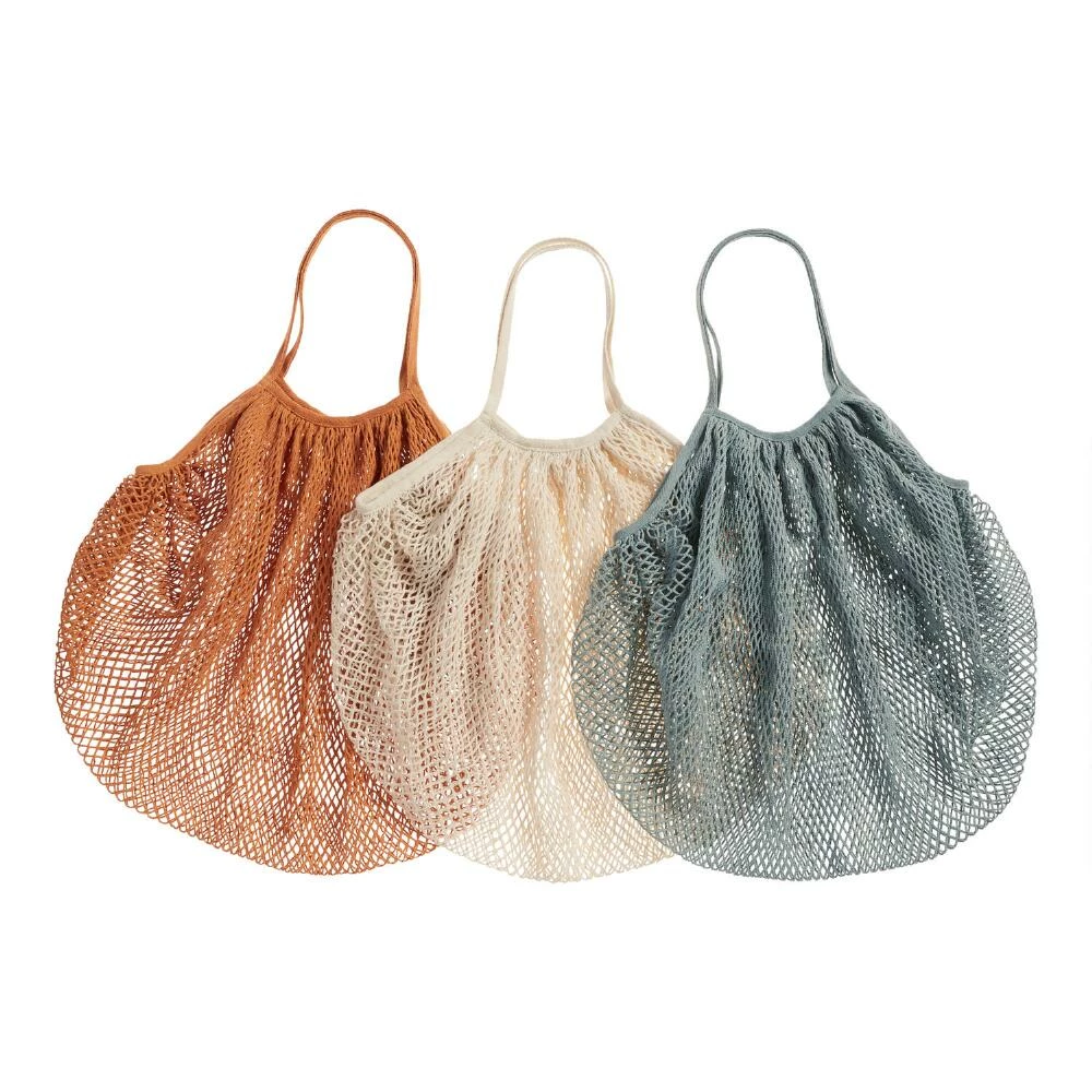 Made of strong 100% cotton, these fishnet-style grocery bags are ideal for toting food and produce home from the farmers market or store. Reusable alternatives to plastic and paper shopping bags with a durable construction and comfortable carrying handles, they clean up nicely after an easy hand wash.