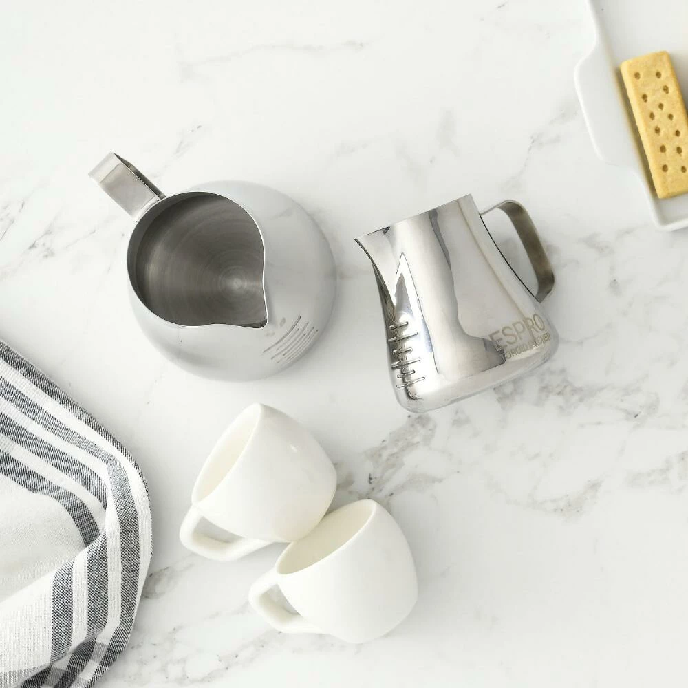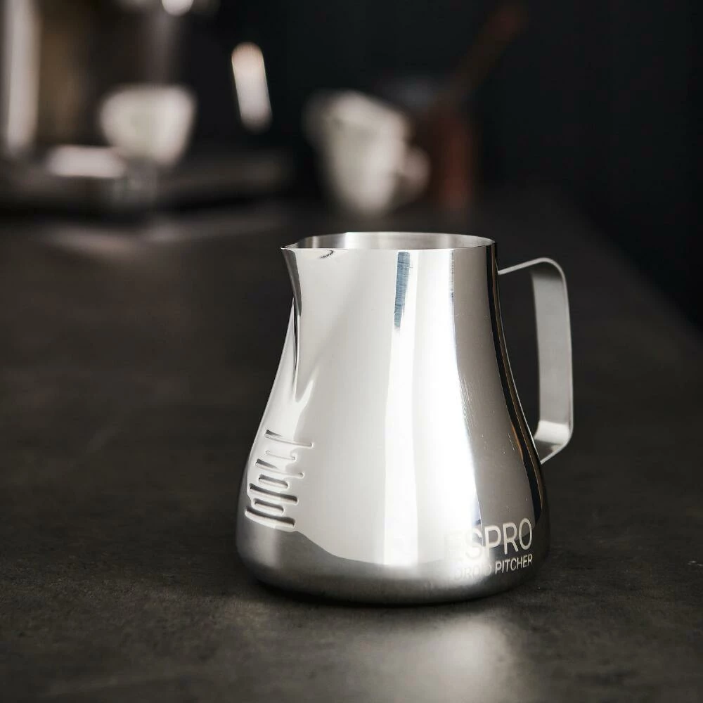 Transform plain espresso into barista-quality lattes and cappuccinos with the chic and shining Espro stainless steel milk-frothing pitcher. Featuring a patented bell shape, it circulates its contents back to the frothing wand to create the creamiest steamed milk imaginable in the least time. Etched with measurement markings, its wide ergonomic handle and formed pouring spout provide the precision control every latte artist needs.