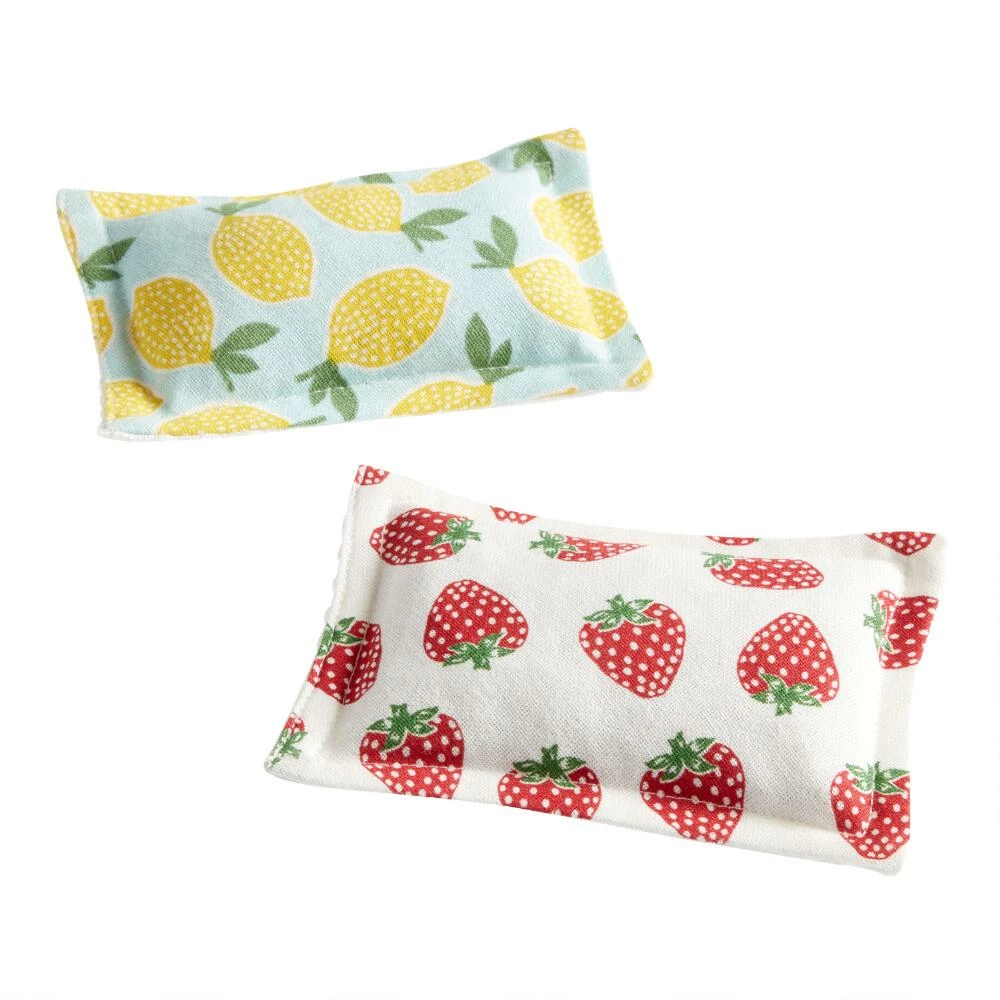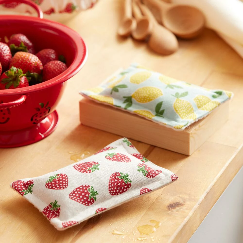 Featuring organic cotton exteriors decorated with our exclusive strawberry and lemon prints, our fruit-patterned sponges are filled with durable natural coir. Adding bright pops of color to the kitchen, these non-scratch sponges are perfect for washing dishes and glasses, soaking up spills and wiping down countertops. Made to last, can just toss them into the washing machine for a quick refresh when they get dirty.