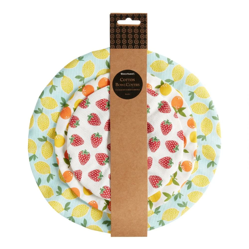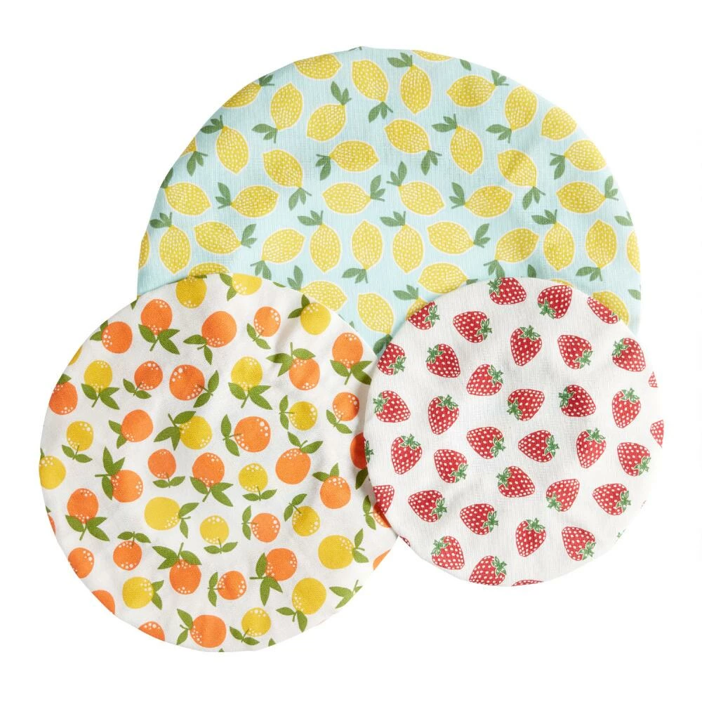 Made of organic cotton with elastic rims and vibrant fruit-filled patterns, our bowl covers are durable and reusable alternatives to disposable plastic wrap and foil. This exclusive set includes small, medium and large covers featuring cute strawberry, orange and lemon artwork. Stretchable to cover food bowls, containers and glassware in an assortment of sizes, they’re also machine washable for easy cleanup.