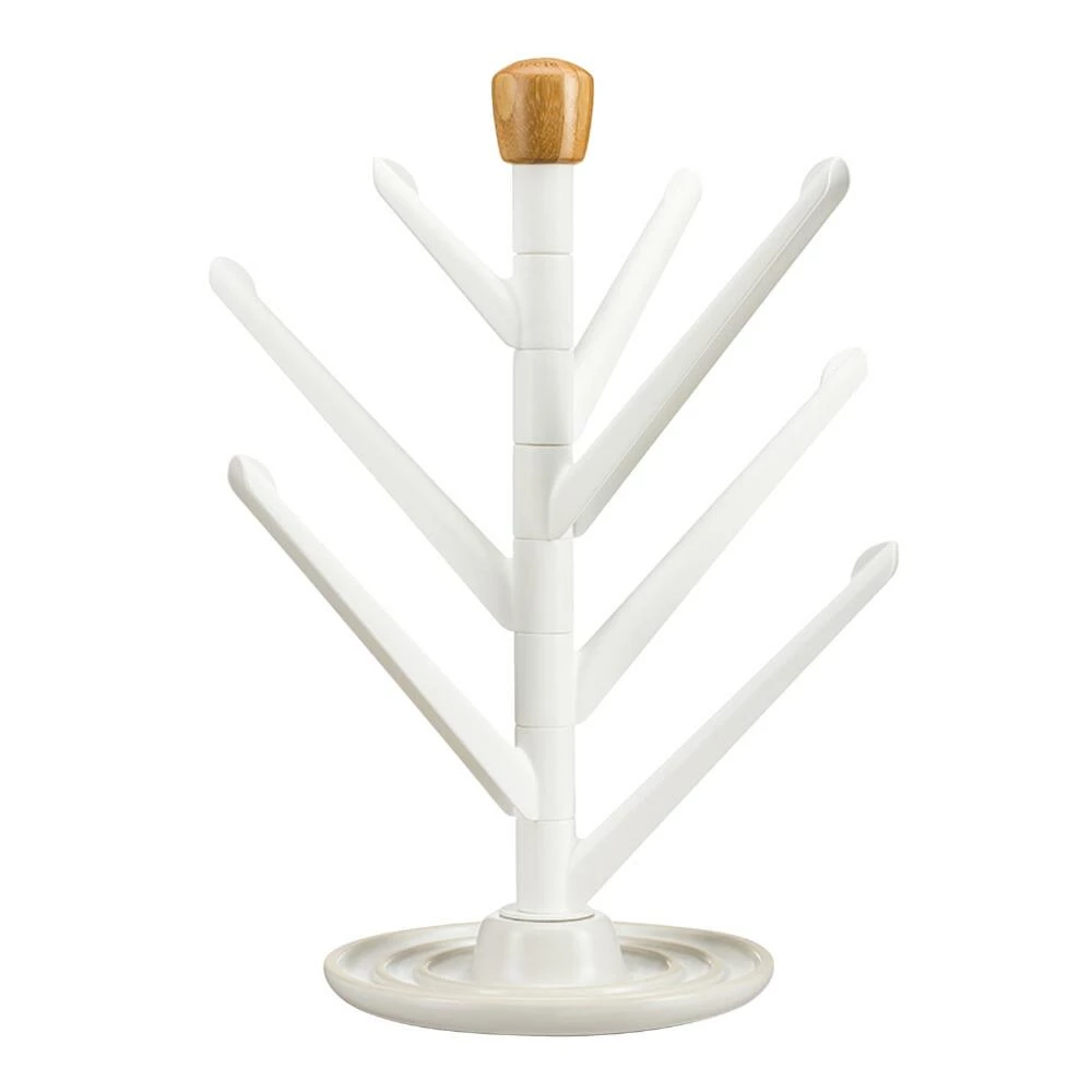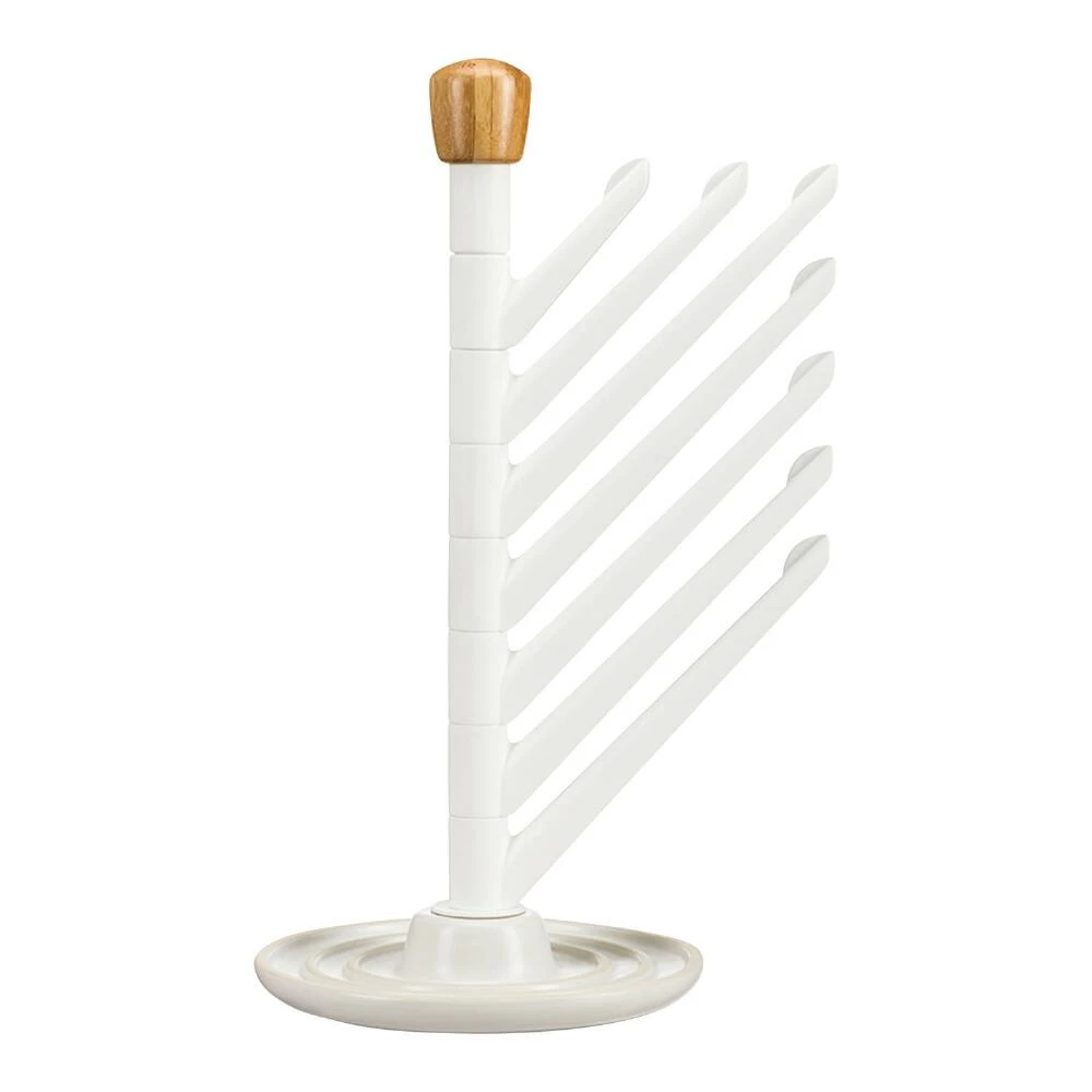 Free up space on your sink countertop with this upright drying rack equipped with seven adjustable arms for holding bulky kitchen items. Made of durable recycled plastic, it features a ribbed ceramic base to catch dripping water and a bamboo knob handle for easy positioning. Its rotating arms are strong enough to hold heavy jars, glasses, long bottles, wet cloths and the other awkward items that overcrowd your dishrack.