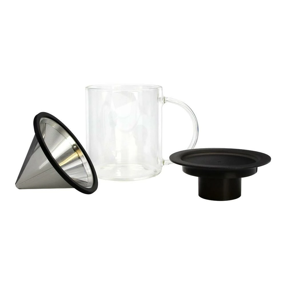 Brew café-quality coffee at home with our pour over coffee set that includes a heat-safe glass mug, a reusable stainless-steel filter and a convenient black lid. Perfect for small kitchens, this two-cup personal coffee maker doesn’t require disposable paper filters and is dishwasher safe for easy cleanup. You can top the glass cup with the lid to keep your fresh-brewed coffee hot and prevent spills when you carry it out of the kitchen.
