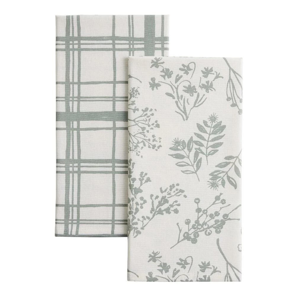 Made of soft cotton for easy cleanup, our kitchen towels add color to your kitchen decor with delicate floral and windowpane designs in muted green and white. Whether you’re wiping down counters or drying dishes, this absorbent set of tea towels is a handy addition to your prep space.