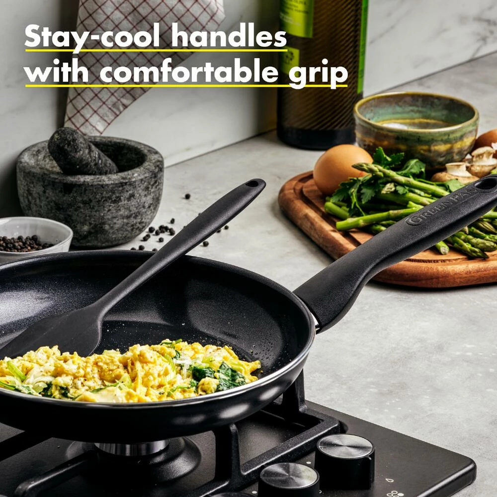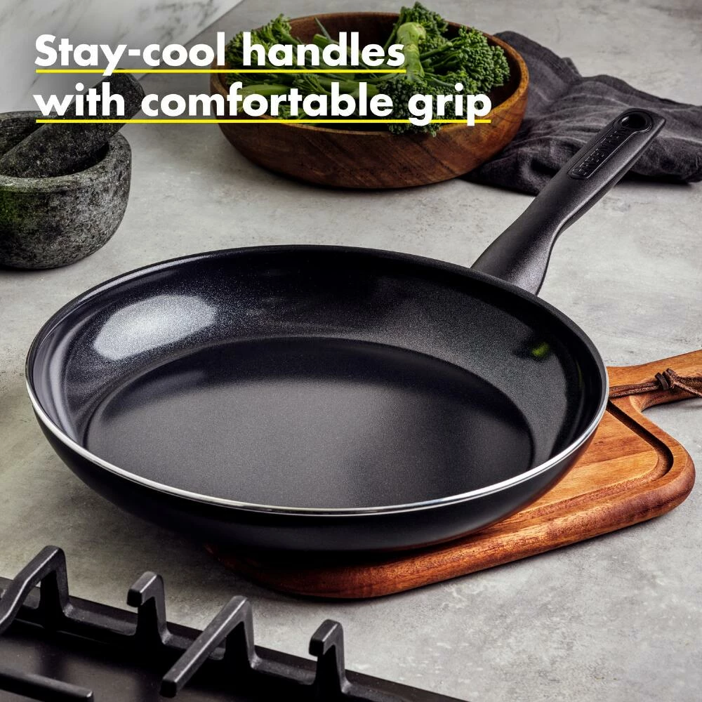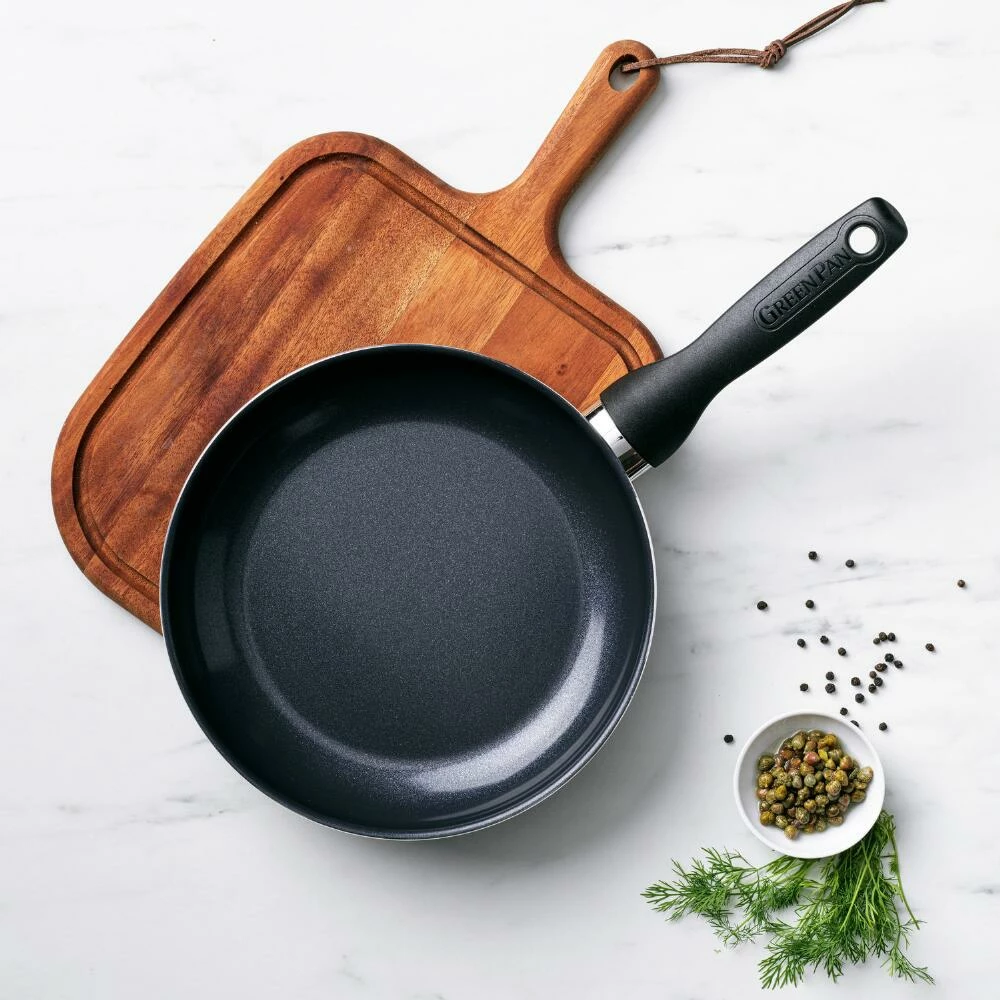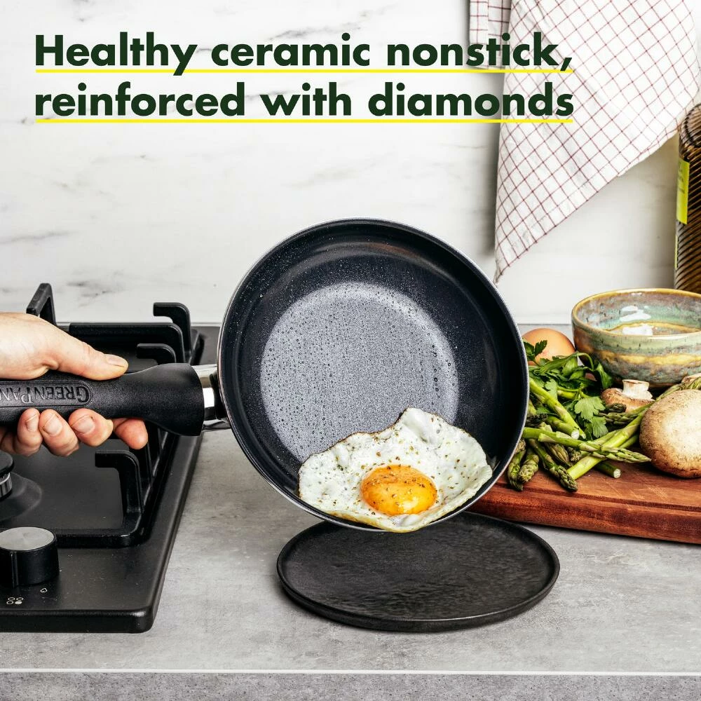GreenPan’s Simply Easy frying pan features a classic deep-black exterior and a nonstick cooking surface coated with their Thermolon ceramic finish. This innovative Thermolon coating is reinforced with diamonds for lasting durability, premium nonstick performance and always-easy cleanup. Crafted of fast-heating aluminum with a stay-cool handle, this nontoxic frypan is a healthier cookware choice that will never release dangerous fumes.