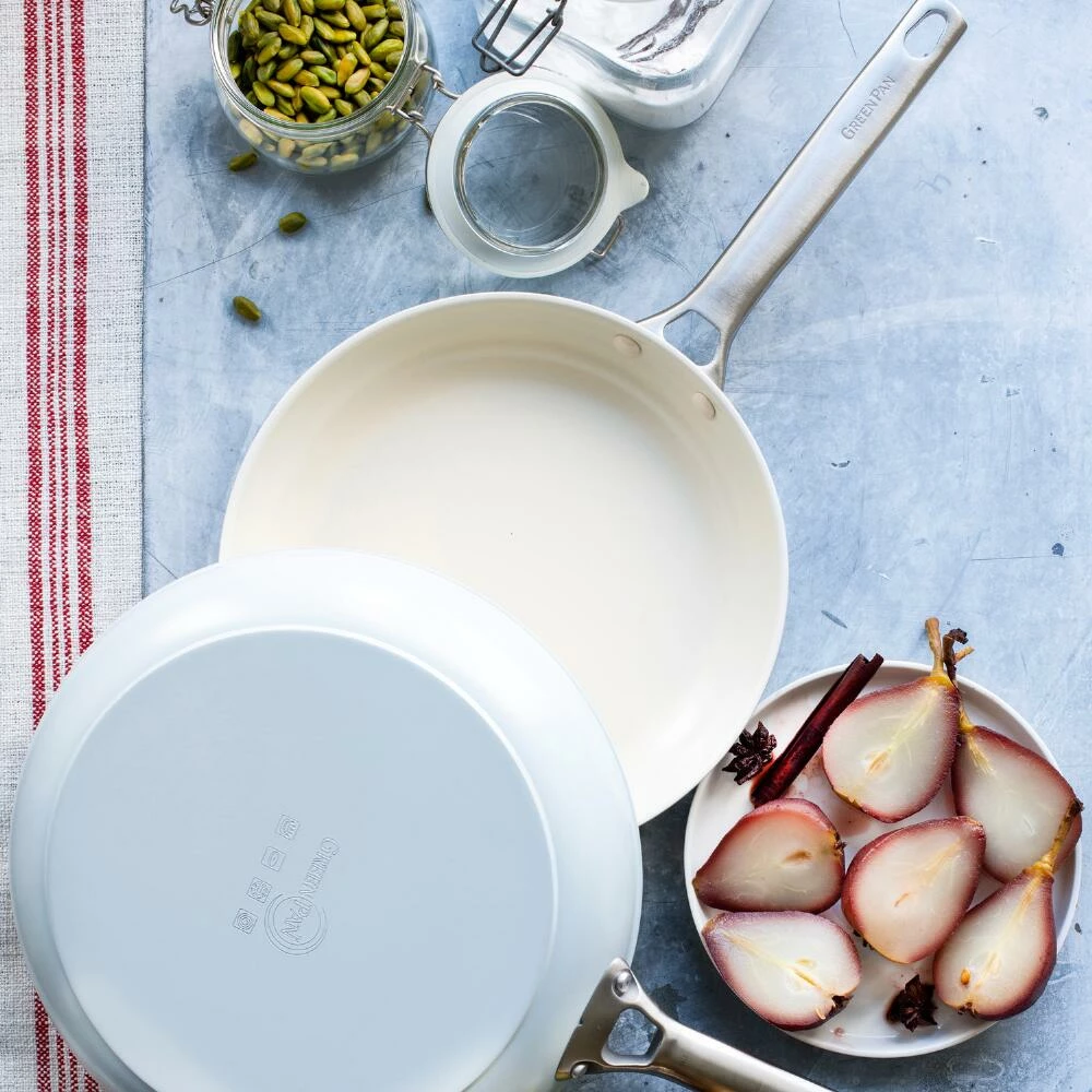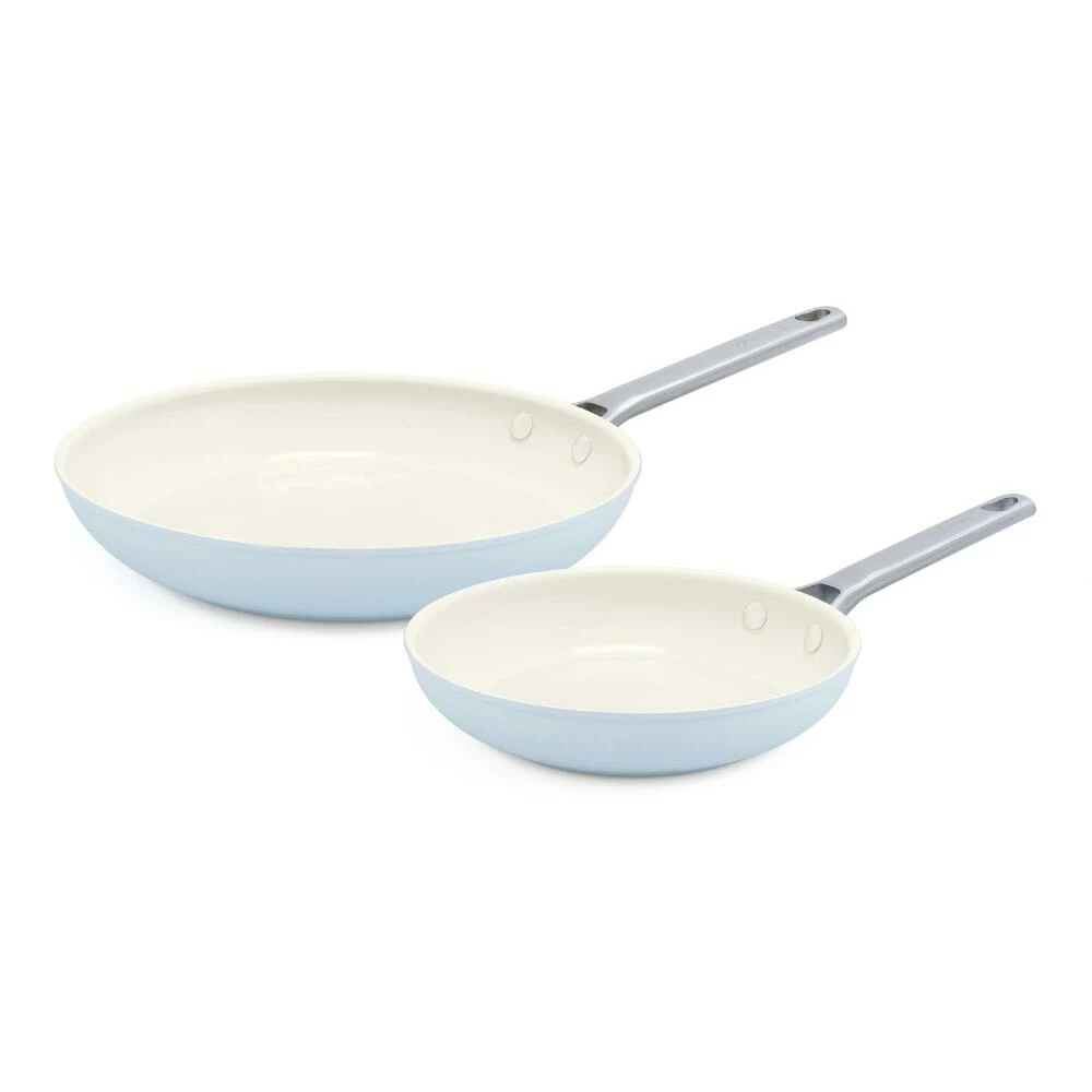 Crafted of hard-anodized aluminum with a light-blue exterior, this two-pack of frying pans features GreenPan’s Thermolon Minerals ceramic-nonstick coating. Offering superior scratch resistance and easy dishwasher-safe cleanup, these fast-heating, 100% nontoxic frypans require less oil to brown and sear foods with perfect results. Equipped with ergonomic stay-cool handles, these versatile cookware essentials are also oven safe.