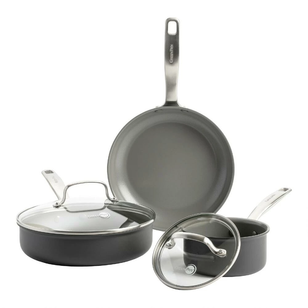Update your kitchen with this nonstick GreenPan Chatham set that includes a 9.5-inch frying pan, a 1-quart covered saucepan and a 3-quart covered saute pan. Each hard-anodized pan features a nontoxic, diamond-reinforced Thermolon ceramic coating for chip-resistant durability and easy release. Healthier cookware for your family and the environment, these easy-clean essentials require less oil to sear, braise or bake foods with superior results.