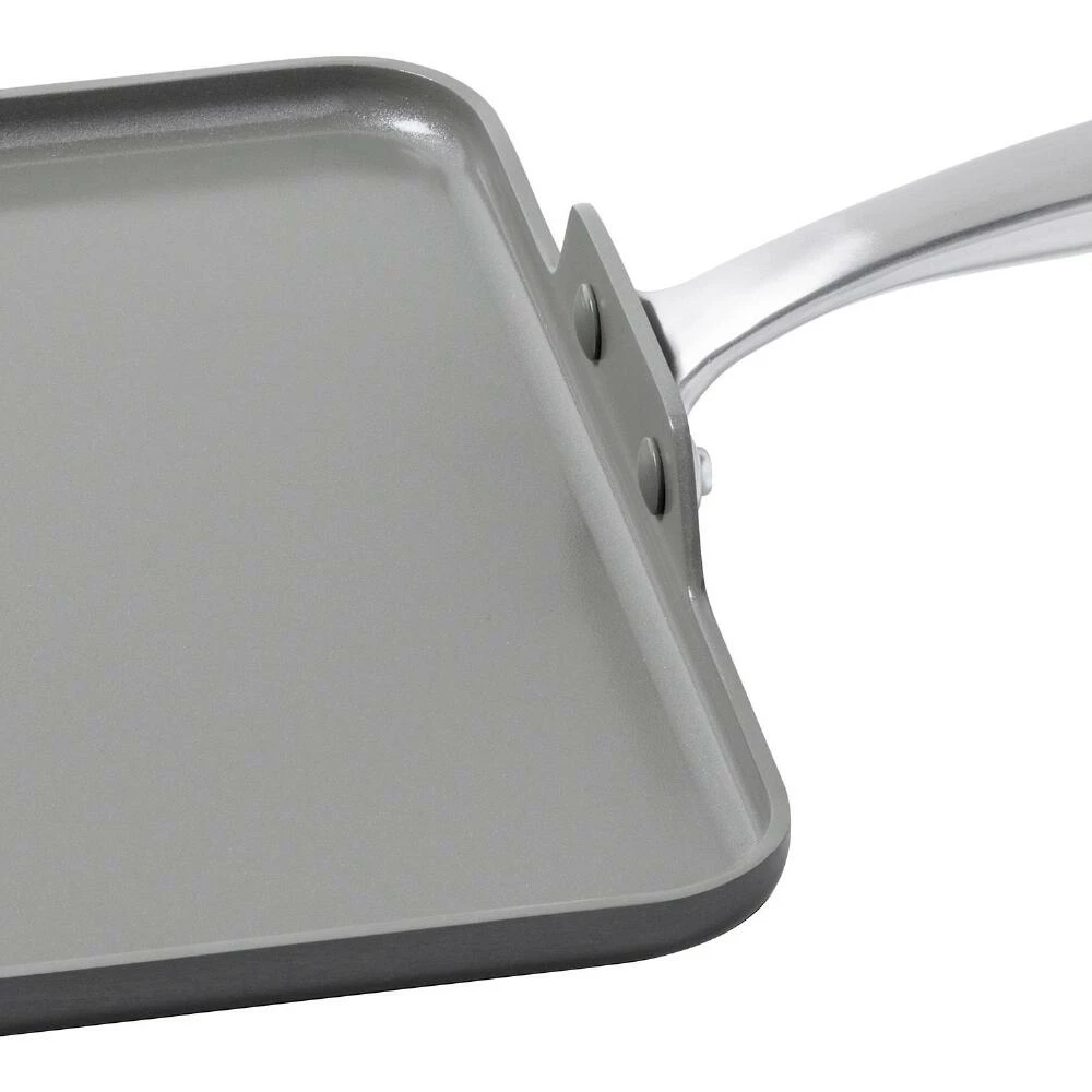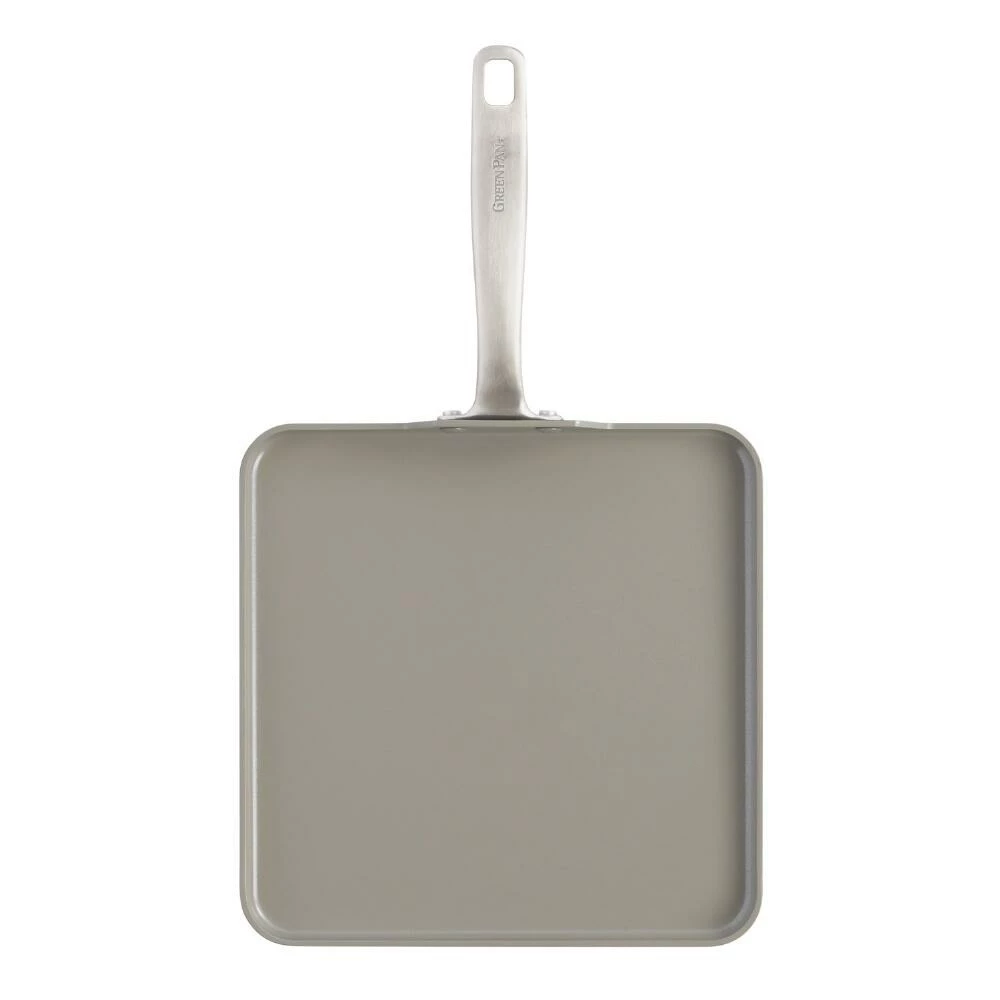 The Chatham 11-inch square griddle pan features a hard-anodized, scratch-resistant body, an ergonomic handle and an innovative nonstick ceramic coating that will never release harmful fumes. Designed by GreenPan to be 100% safe for both your family and the environment, this versatile griddle boasts a large surface area that heats quickly and evenly, remains safe at high temperatures and requires less oil to brown crispy foods to perfection.