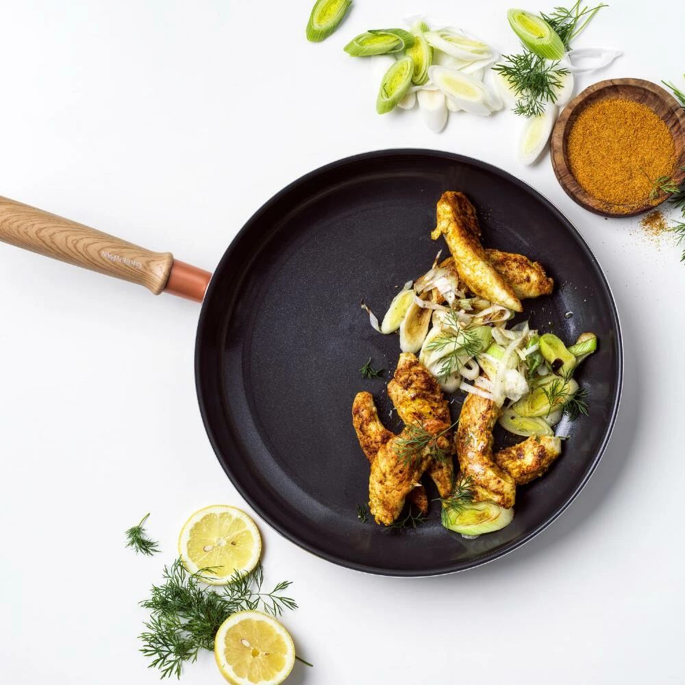 The 12-inch Forage frying pan features a fast-heating aluminum base coated in nonstick ceramic, beautiful copper-hued exterior and heat-safe handle with a rustic woodgrain finish. Diamond-reinforced for superior durability, it distributes heat evenly, is oven safe and stays easy to clean. Like all GreenPan cookware, this premium frypan is a healthier choice for the family and the environment that never releases toxic fumes.