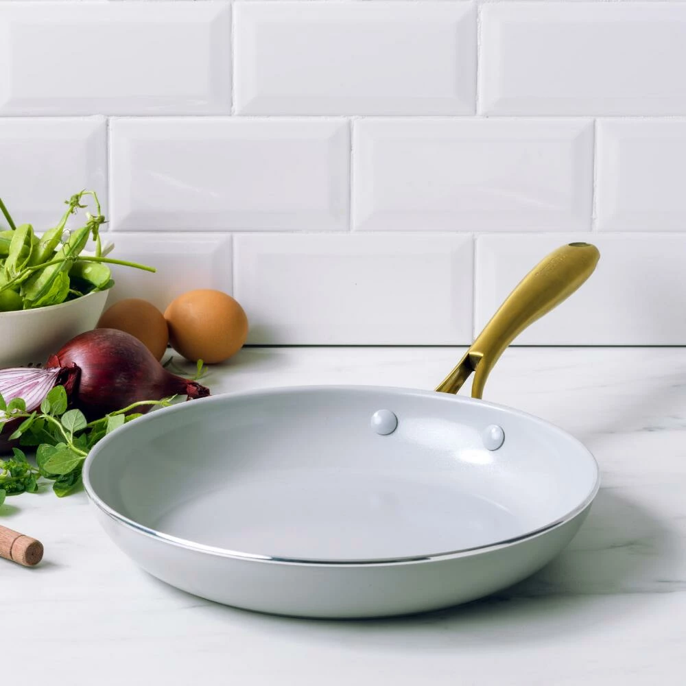 Featuring a forged base coated in nonstick ceramic, a dove-gray finish and riveted handle in glam gold, the 10-inch Provision frying pan is reinforced with diamonds for exceptional durability. It heats quickly and evenly on the stovetop or in the oven and is always easy to clean. Like all GreenPan cookware, this premium frypan is a healthier choice for the family and the environment that never releases toxic fumes.