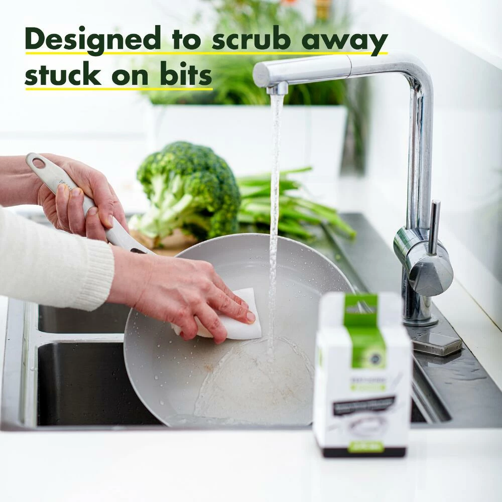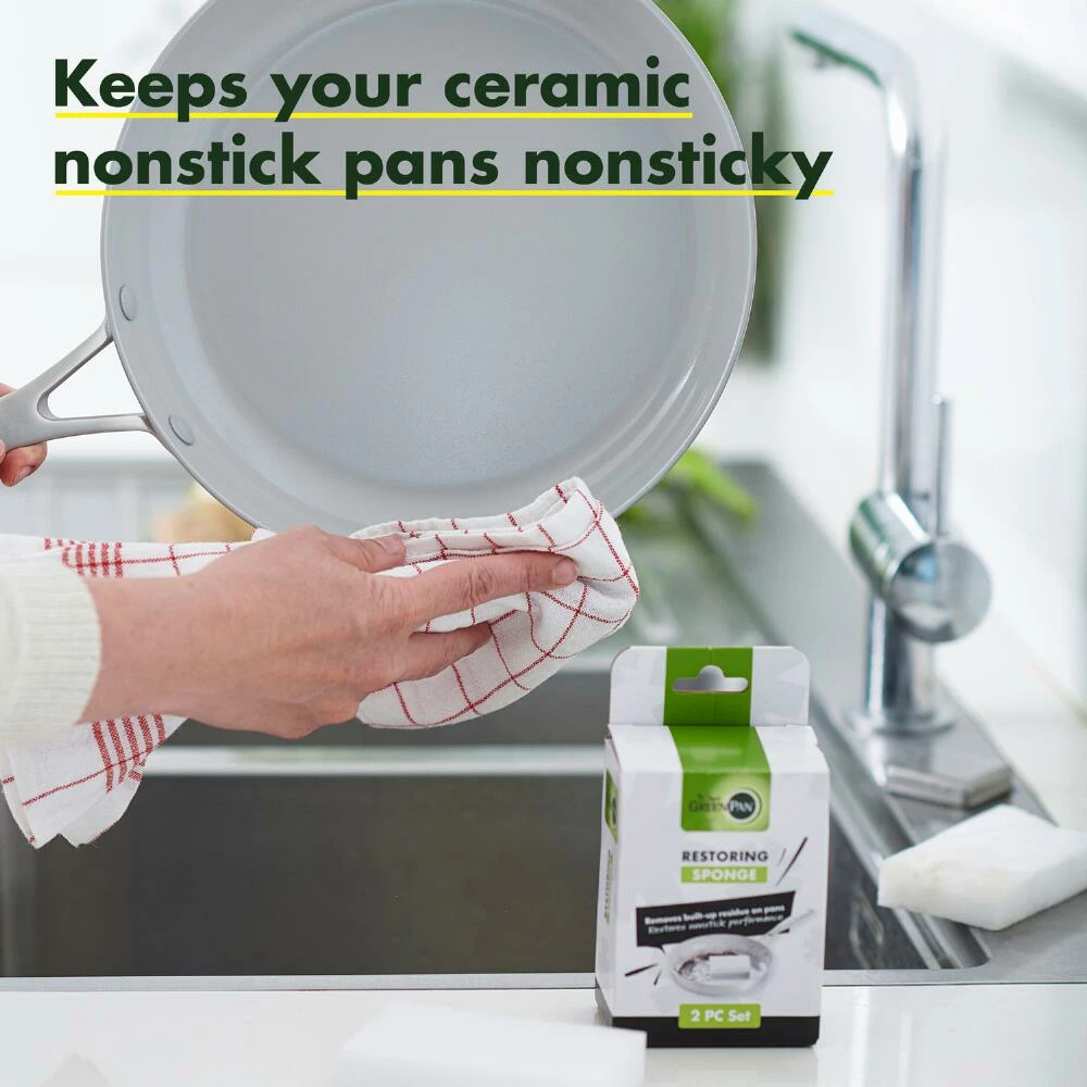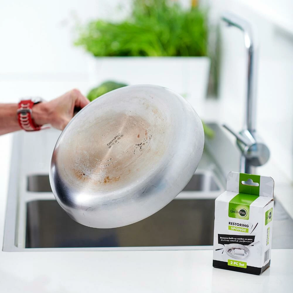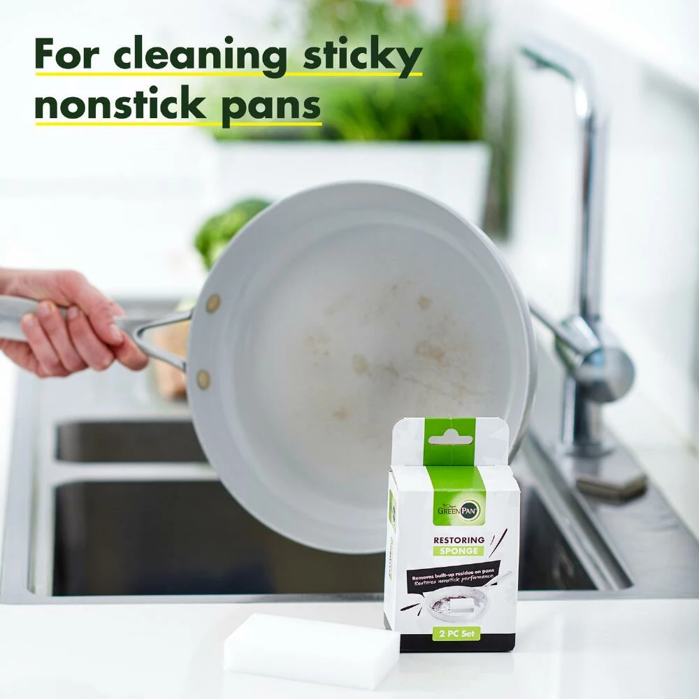 Made of non-abrasive melamine, this scrubbing sponge is specially designed to clean your GreenPan ceramic cookware and other nonstick pots and pans. Cutting through tough stains, this unique restoring sponge features micro-scrubbers that remove food debris and carbonized fats with just water, no soap required. Use this simple tool to restore your cooking essentials to excellent condition.
