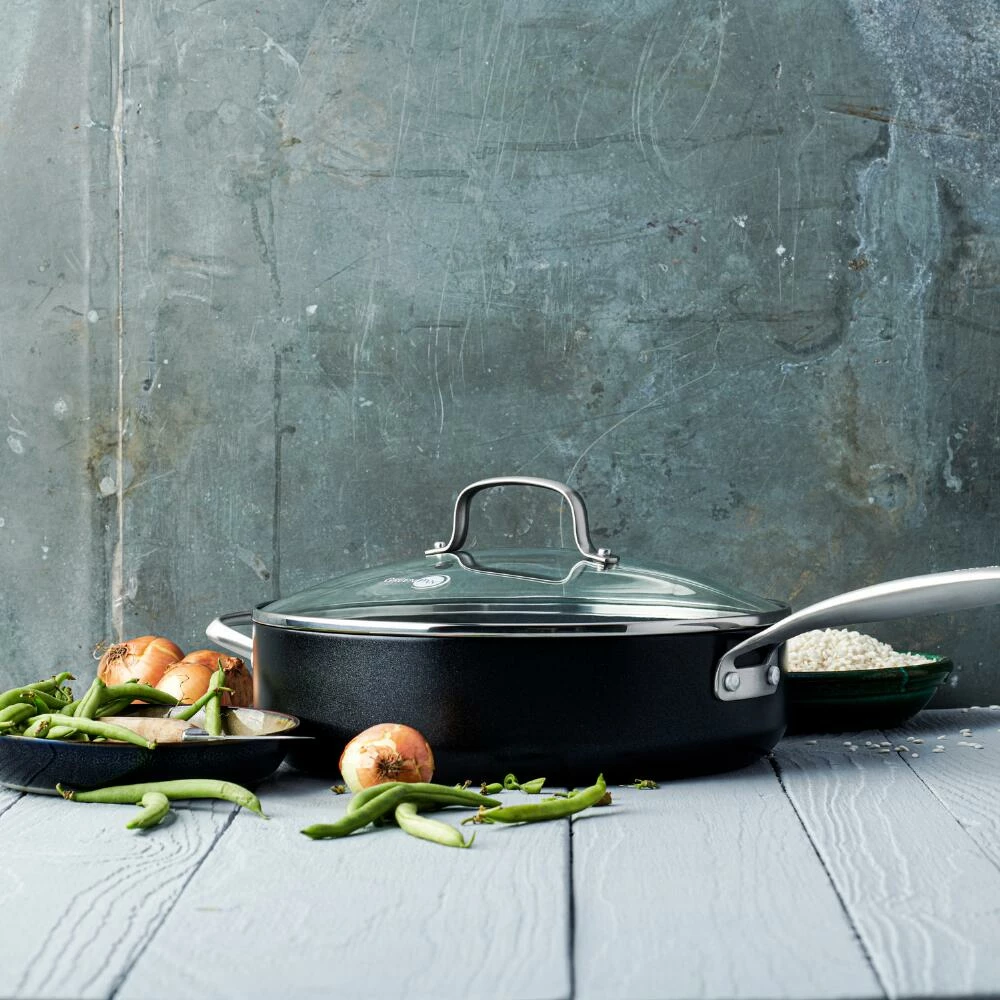 Crafted of hard-anodized aluminum with a black exterior, this large saute pan is coated with an innovative Diamond Advanced ceramic-nonstick finish. Infused with multiple diamond layers for superior scratch resistance and faster, more even heating, this 100% toxin-free pan features an oven-safe glass lid and an ergonomic handle. Offering a larger cooking surface than comparable GreenPans, this versatile essential is ideal for everyday use.