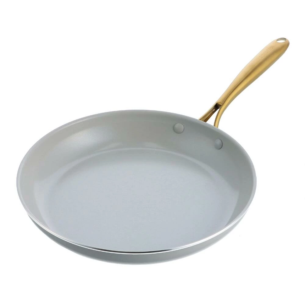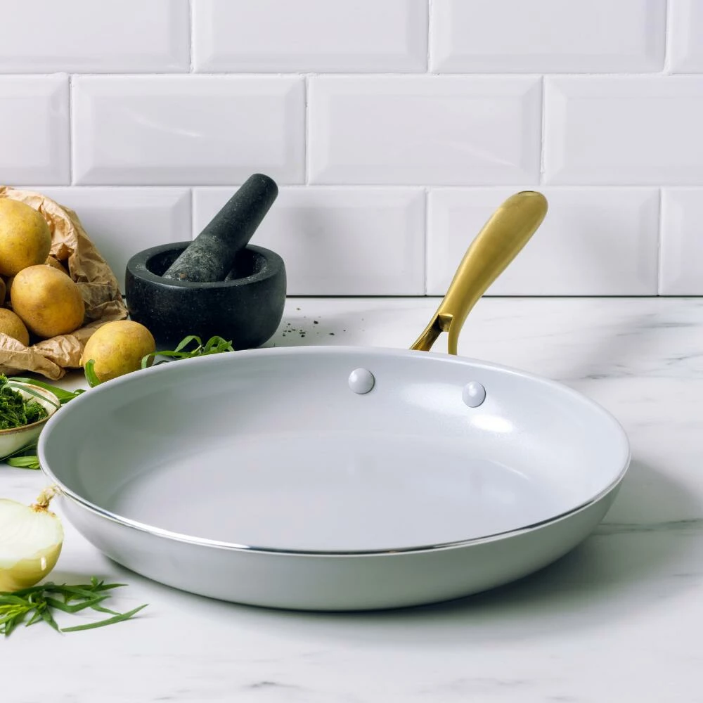 Featuring a forged base coated in nonstick ceramic, a dove-gray finish and riveted handle in glam gold, the 12-inch Provision frying pan is reinforced with diamonds for exceptional durability. It heats quickly and evenly on the stovetop or in the oven and is always easy to clean. Like all GreenPan cookware, this premium frypan is a healthier choice for the family and the environment that never releases toxic fumes.