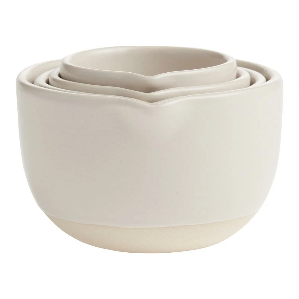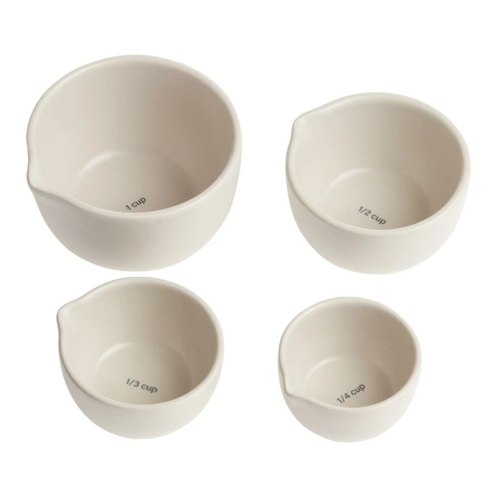Made of stoneware in a neutral blend of gray and beige, our durable measuring cups feature convenient pouring lips and a nesting design for space-saving storage. Their on-trend greige color gives these exclusive cooking and baking tools refined farmhouse charm.