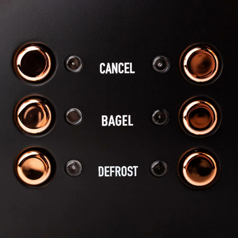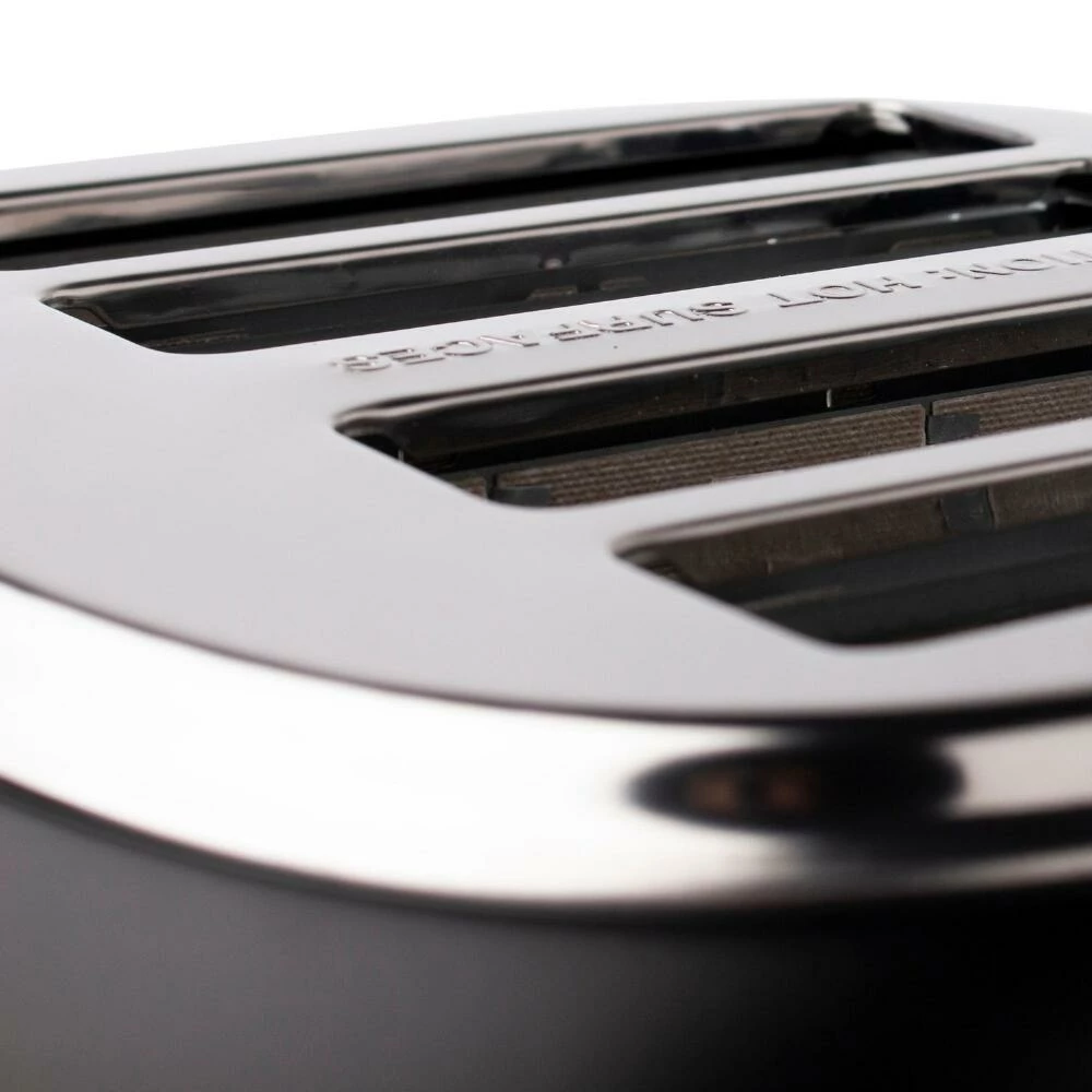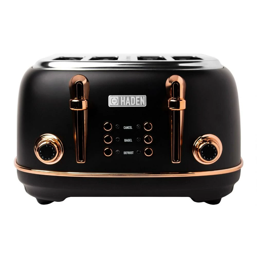 Designed by Haden of England with extra-wide, self-centering slots, the traditional Heritage 4-slice toaster is beautiful in black with sleek copper-hued accents. This retro stainless-steel toaster includes dual toasting levers, browning dials and quick-press defrost, bagel and cancel buttons. A welcome addition to family kitchens, this convenient large toaster makes it easy to attune the two slots on each side to individual preferences.