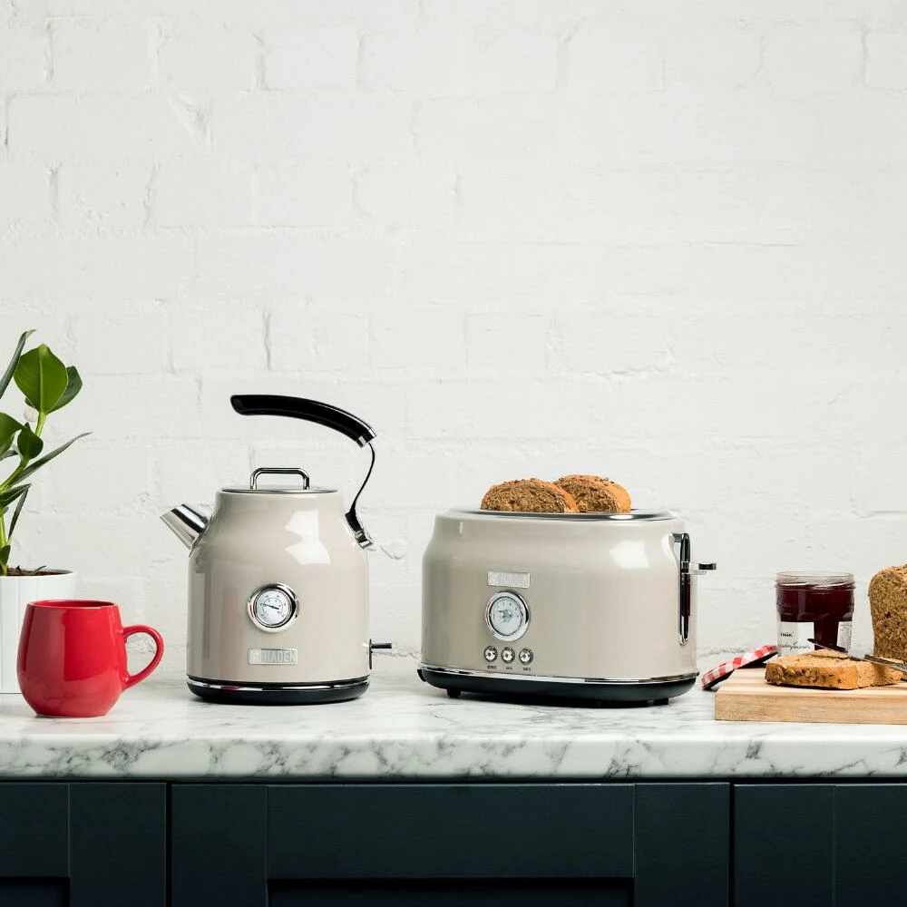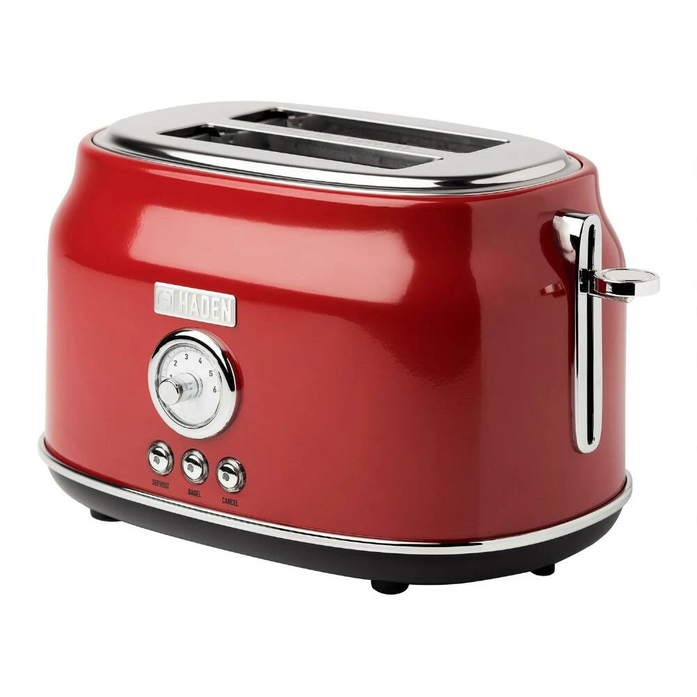 Designed by Haden of England with a sleek retro shape, the Dorset 2-slice toaster features extra-wide, self-centering slots for a premium toasting experience. Its elegant control panel includes a chic analog browning dial and buttons for defrosting, bagels and canceling. Its painted stainless-steel body comes in bold red or neutral putty colors to start your morning off in style.