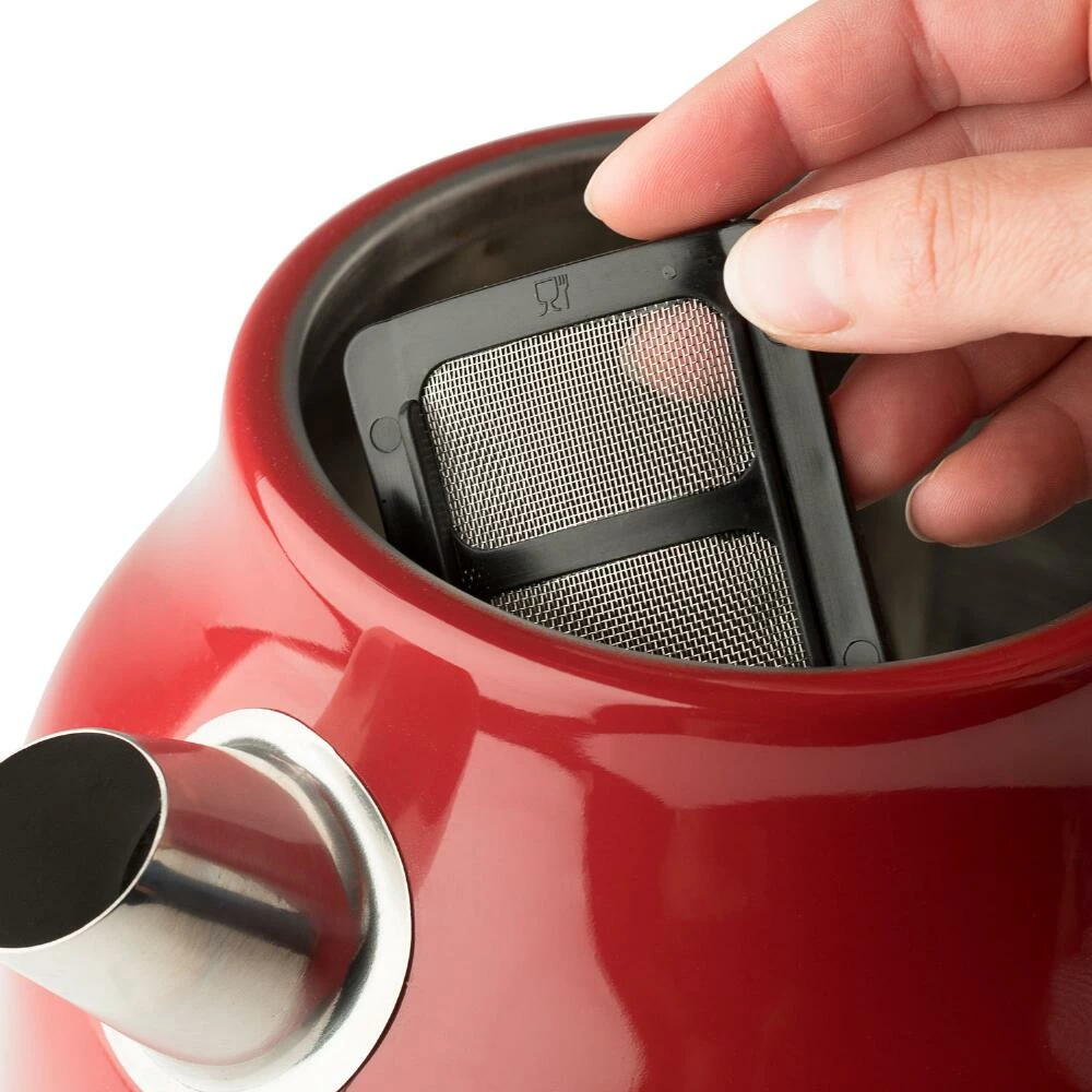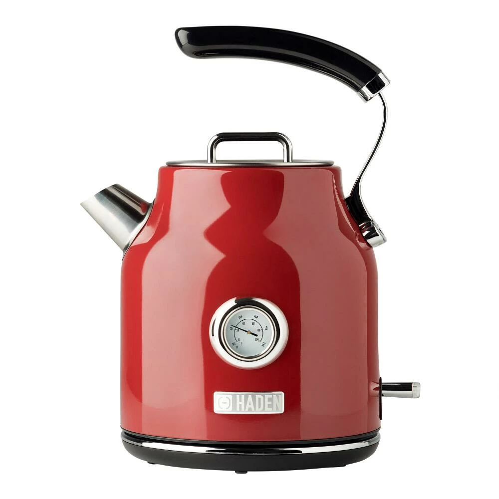 Created by the renowned Haden of England, the stylish retro design of the Dorset cordless electric water kettle is a beautiful start to the day. This sophisticated coffee and tea kettle features a fast-heating base that stays cool to the touch, a lever handle for easy pouring, a chic analog temperature gauge, a removable water filter and a large 7-cup capacity. Its painted stainless-steel body comes in bold red or neutral putty colors.