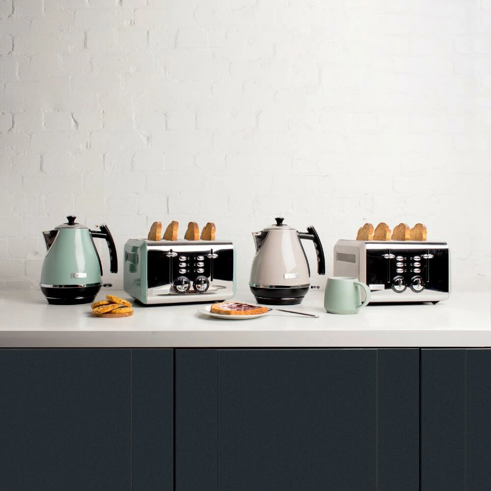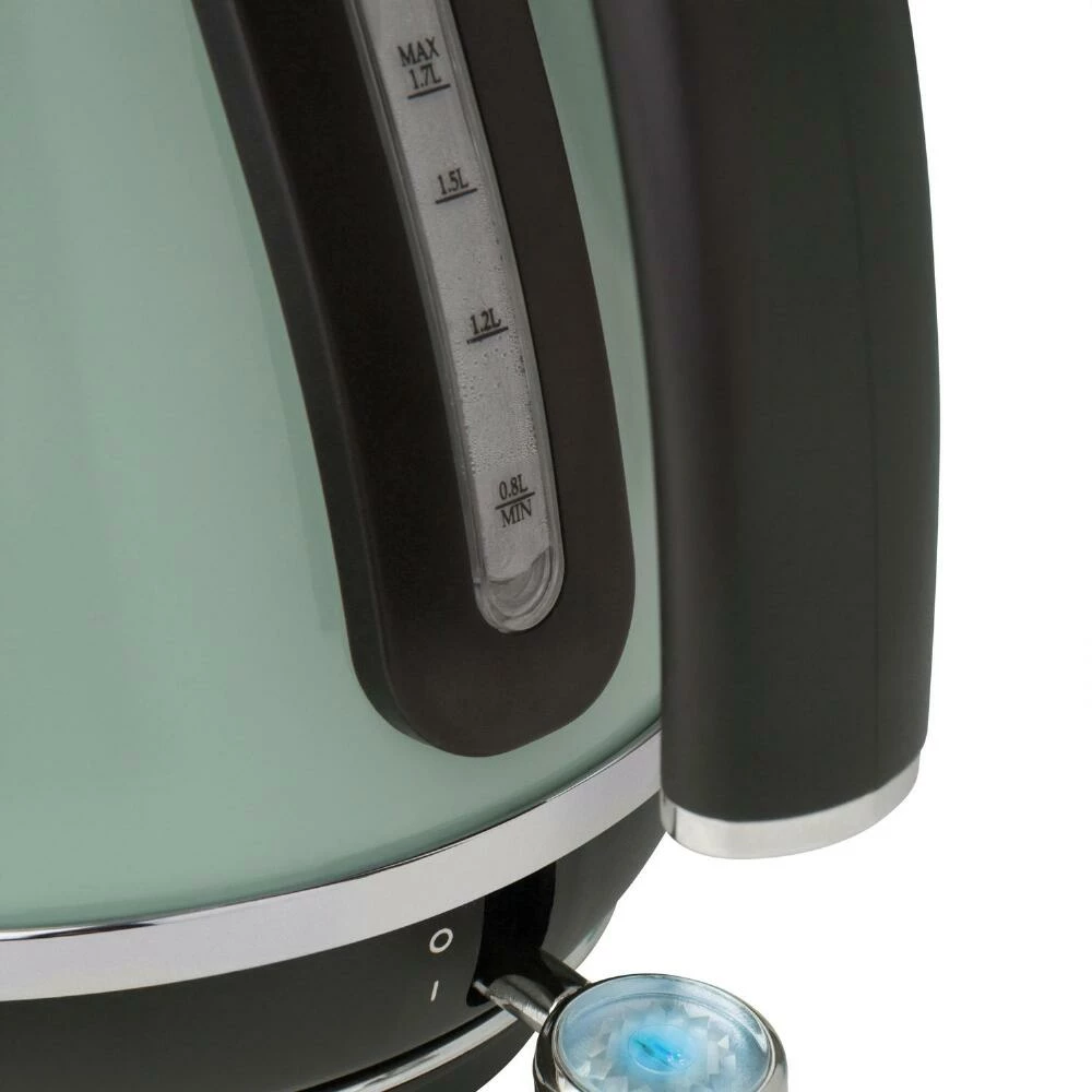 Created by the renowned Haden of England, the Cotswold cordless electric water kettle is simply elegant in sage green. This beautiful stainless-steel coffee and tea kettle features an ergonomic handle for easy pouring, a convenient water-level window, a removable water filter with a handy replacement and a large 7-cup capacity. Its fast-heating base stays cool to the touch, turns off automatically and prevents dry boiling.