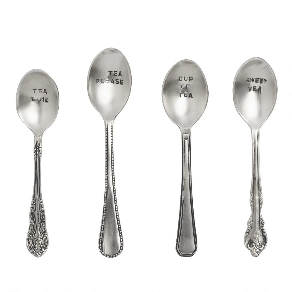 Our antique-inspired teaspoons feature a fine assortment of vintage-style handles for a charmingly eclectic approach to teatime. Hand stamped with endearing expressions like “Sweet Tea” and “Tea Please,” this set of four makes an excellent housewarming gift.