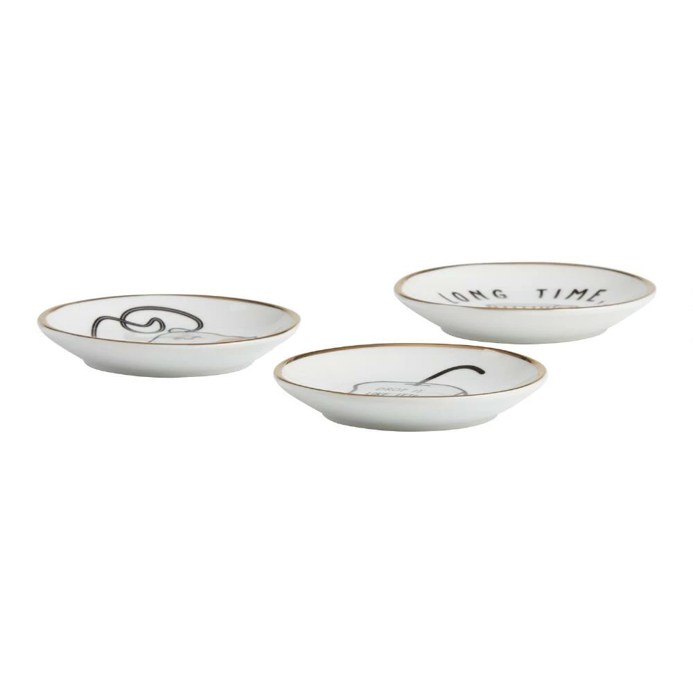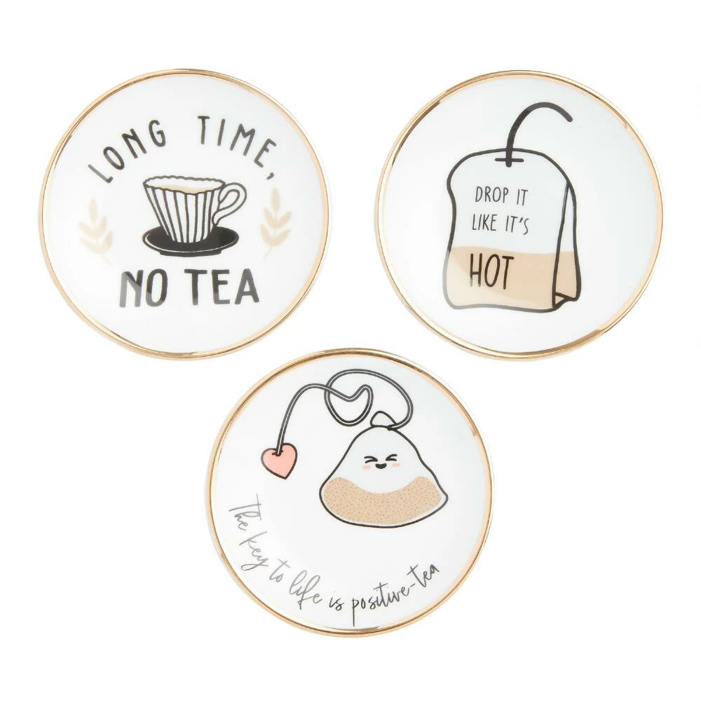 Crafted of ceramic with gold rims and white surfaces printed with our exclusive illustrations, these round tea rests are small in size and big in personality. Featuring “The Key to Life is Positive-Tea,” “Drop It Like It’s Hot” and “Long Time, No Tea” designs with detailed coordinating artwork, they bring a cheerful look to the counter or table and provide the perfect spot to place used tea bags and spoons.