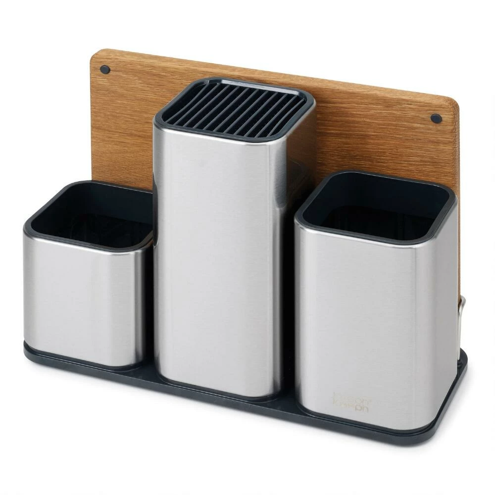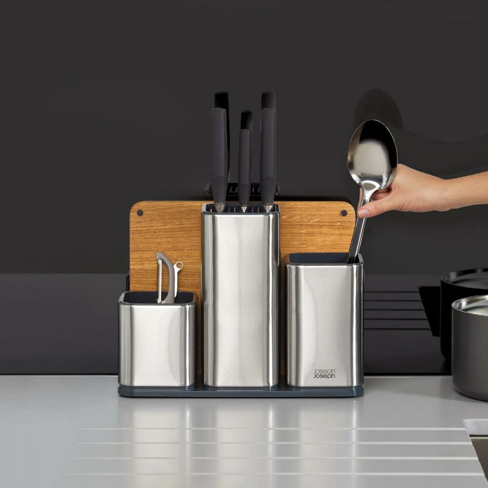 Featuring two utensil containers and a non-scratch knife holder, this innovative Joseph Joseph kitchen organizer is a brilliant storage essential. Made of sleek, easy-to-clean stainless steel, this countertop storage piece also includes a compact oakwood chopping board that stows neatly behind the utensil canisters when not in use.