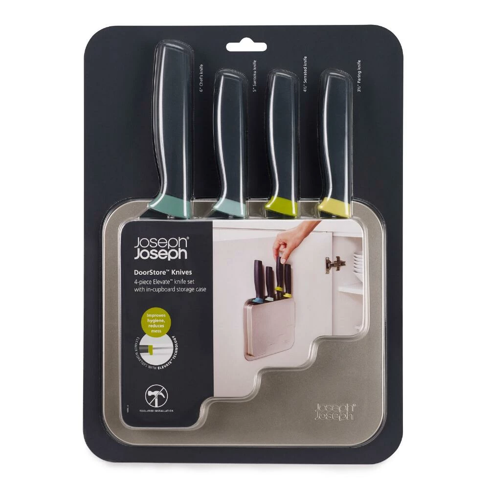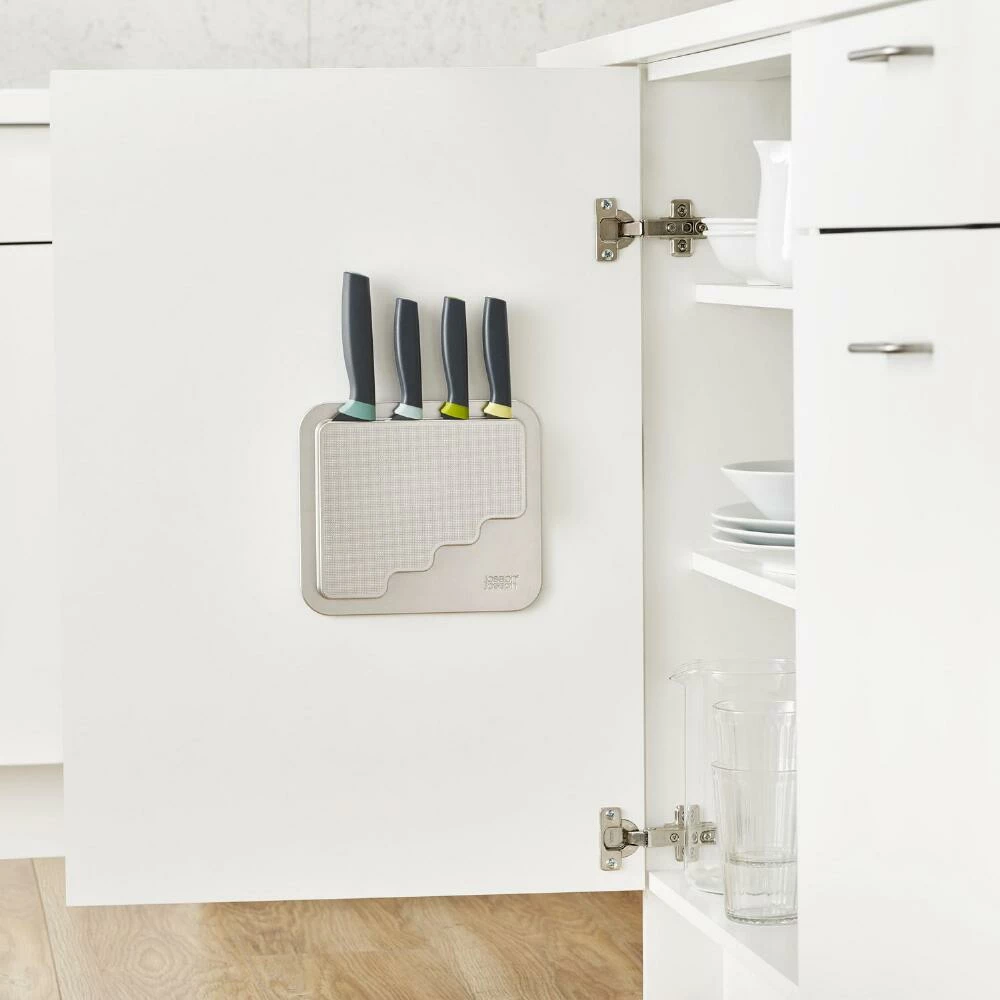 A space-saving alternative to traditional knife blocks, this Joseph Joseph knife set spares countertop space by mounting on a wall or the inside of a cabinet door. It includes a paring knife, serrated knife, santoku knife and chef’s knife that store compactly in an ultra-slim case. Each knife features a weighted handle for a comfortable grip and a built-in knife rest to keep the blade from touching your work surface.