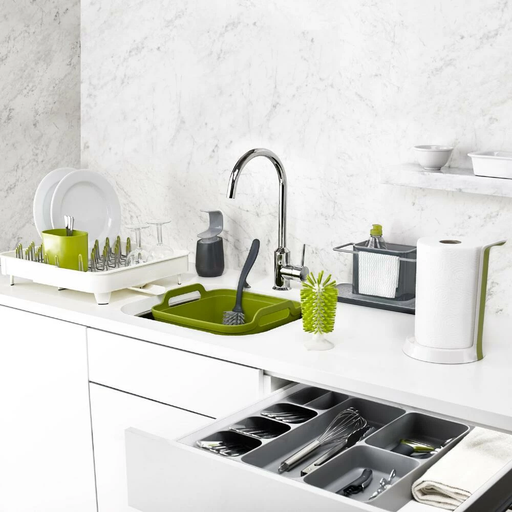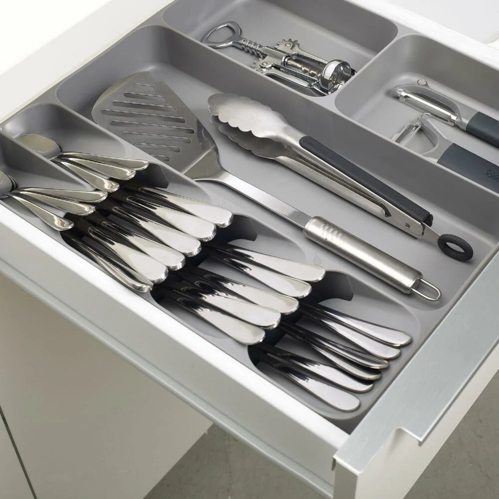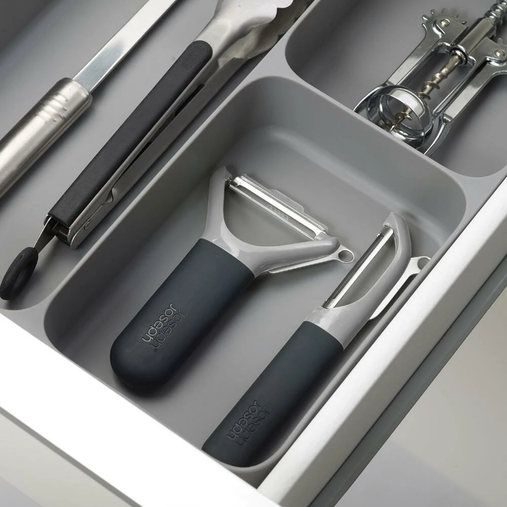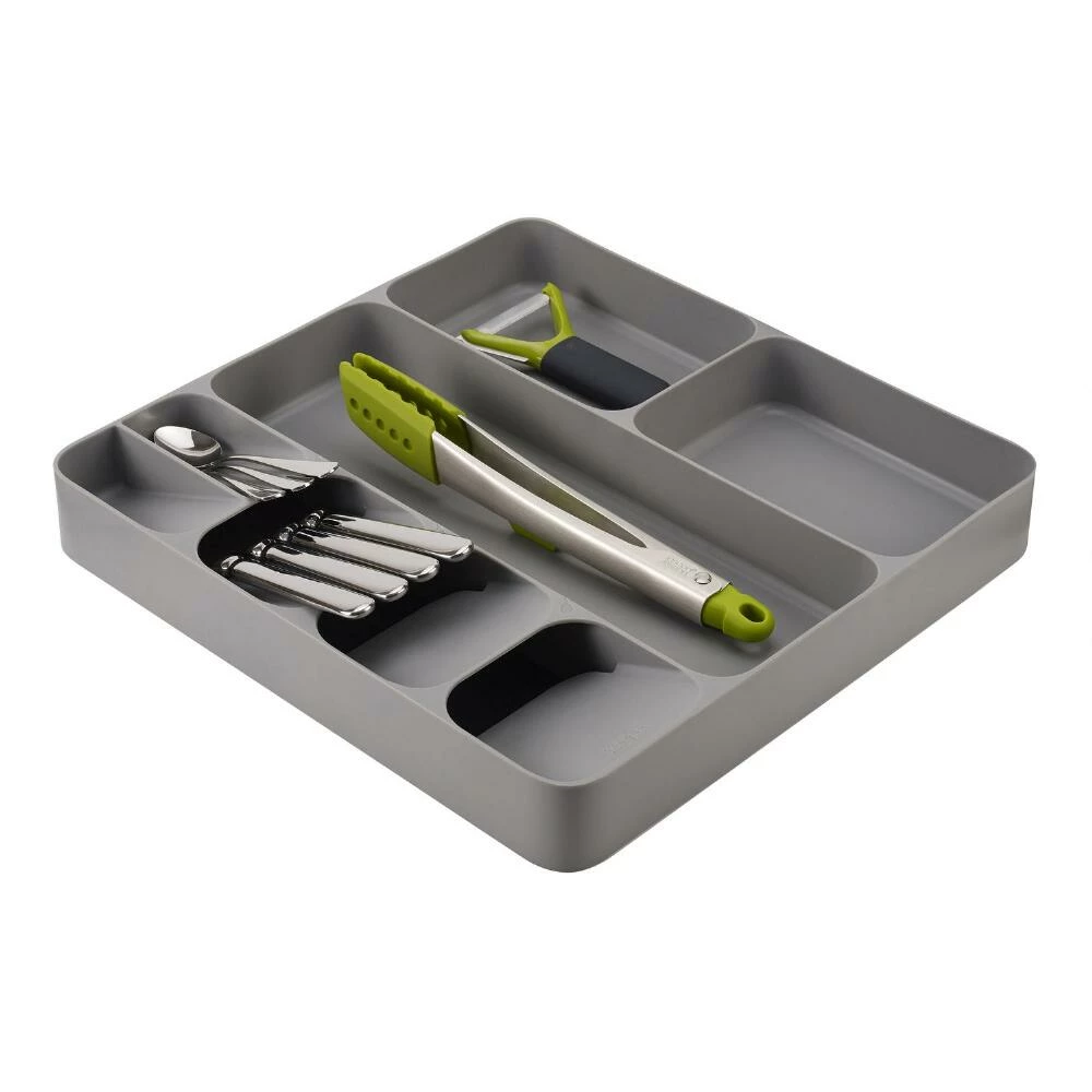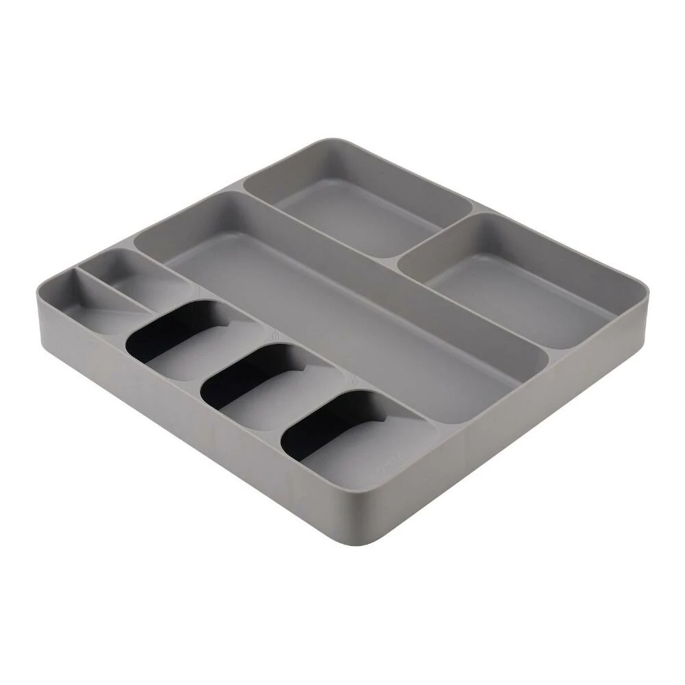Organize your cutlery, gadgets and cooking utensils with this practical storage solution that fits neatly in a kitchen drawer. It features five overlapping compartments for silverware, two deep compartments for gadgets like peelers and bottle openers and a long compartment for spatulas, whisks and other large utensils. Durable and BPA-free, the DrawerStore reduces messy clutter and keeps your kitchen essentials easily accessible.