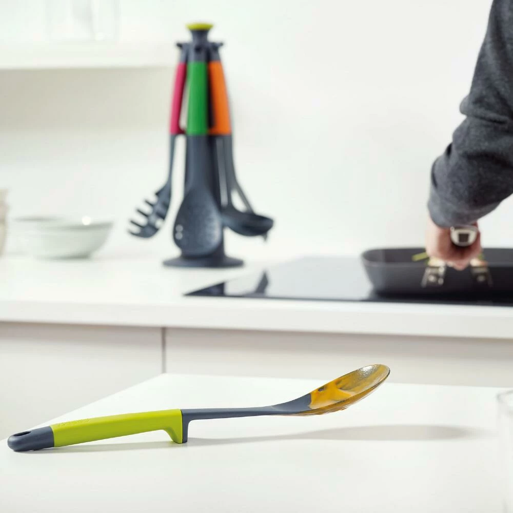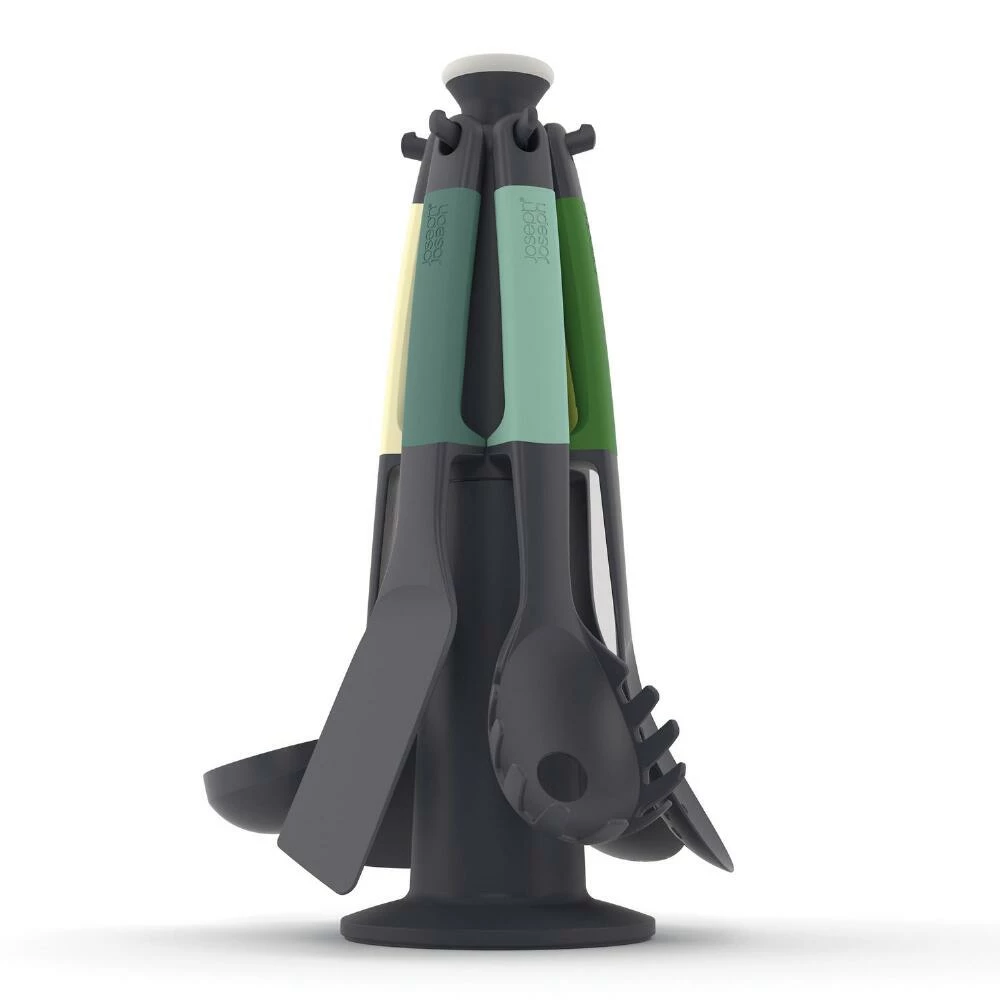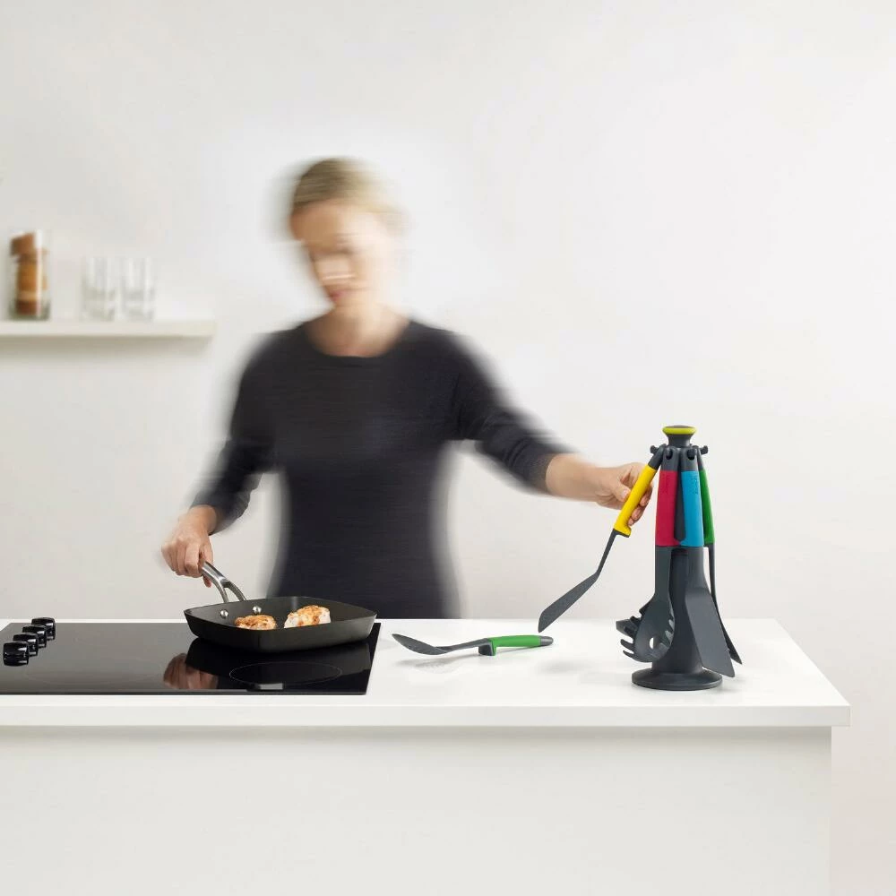 This innovative Joseph Joseph utensil set features an ultra-compact design that utilizes vertical space. With six essential spoons and spatulas for sautéing, stirring and serving, each piece in this kitchen tool set stores neatly on the included rotating stand for easy access. Available in your choice of Multicolor or Opal hues, this spoon set features weighted handles and built-in rests to keep your tools from touching your work surface.