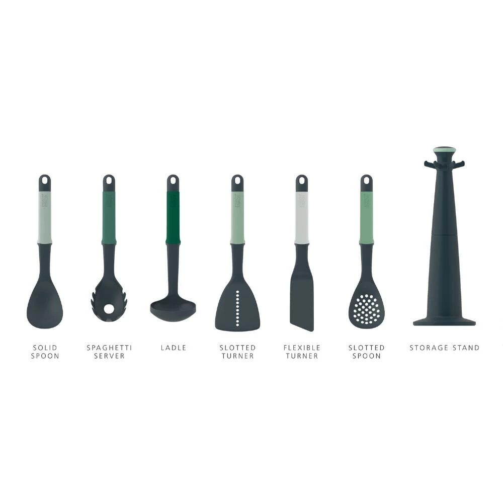 - 6-Piece includes slotted spoon, solid spoon, flexible turner, slotted turner, ladle, spaghetti server and rotating storage stand