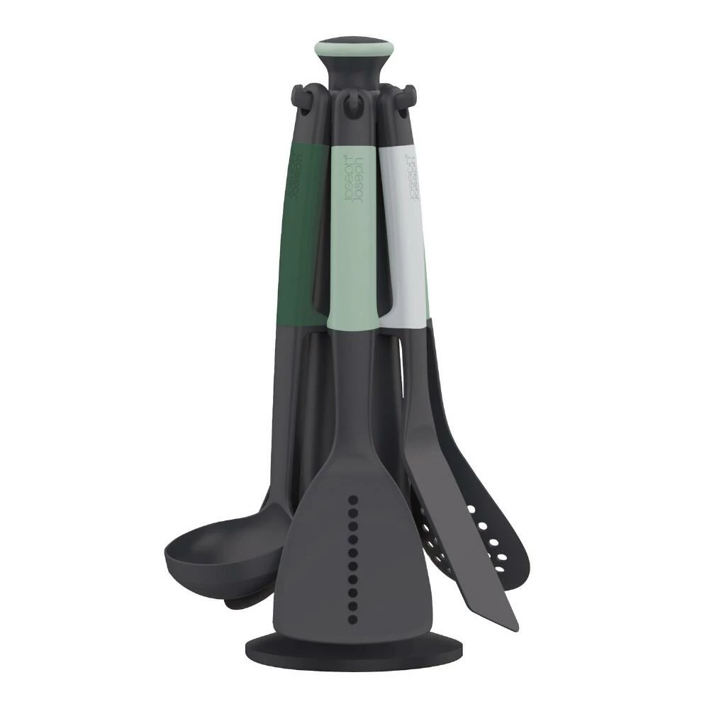 This innovative Joseph Joseph utensil set includes six assorted spoons and spatulas for sauteing, stirring and serving that store neatly on a compact carousel. These clever kitchen tools feature weighted handles and built-in rests that keep their silicone heads from touching your work surface. Available in sky-blue and sage-green colors, the dishwasher-safe utensils stay organized and easily accessible on the stylish rotating stand.