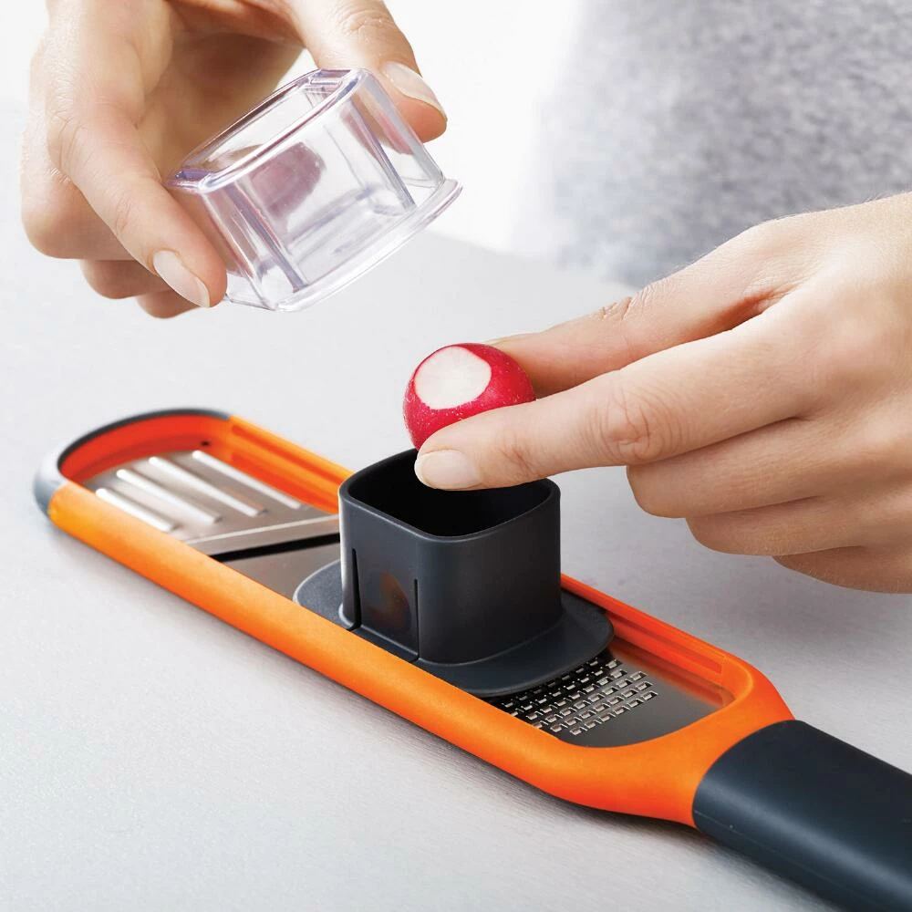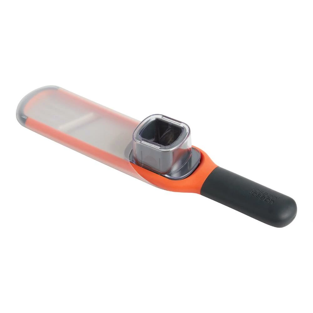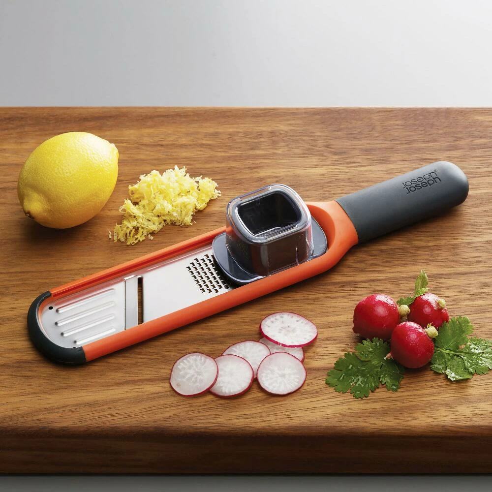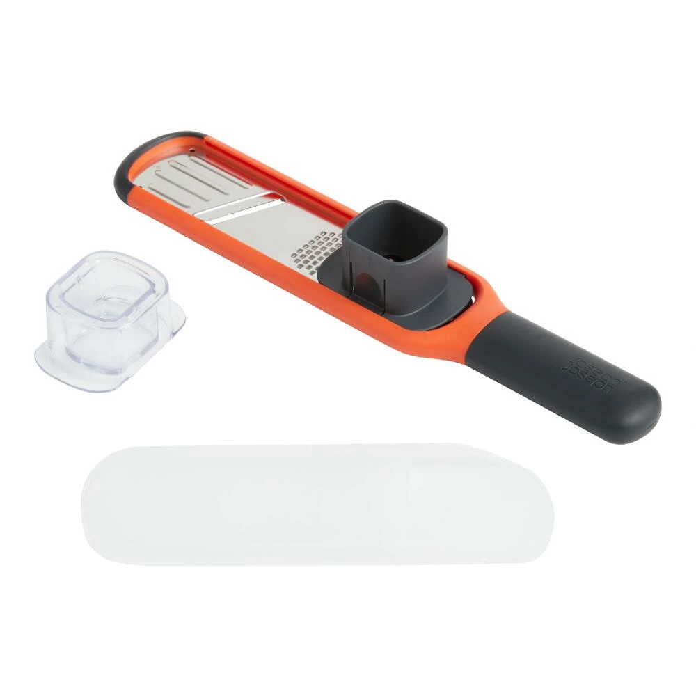 Featuring stainless-steel teeth and a razor-sharp blade, this two-in-one grater and slicer is the perfect mini mandolin for cooking prep. An optional guard keeps your fingers protected as you grate garlic, ginger, parmesan cheese and other small foods while an ergonomic handle provides full control when you slice larger vegetables. It’s dishwasher-safe for quick cleaning and includes a sheath for safe storage.