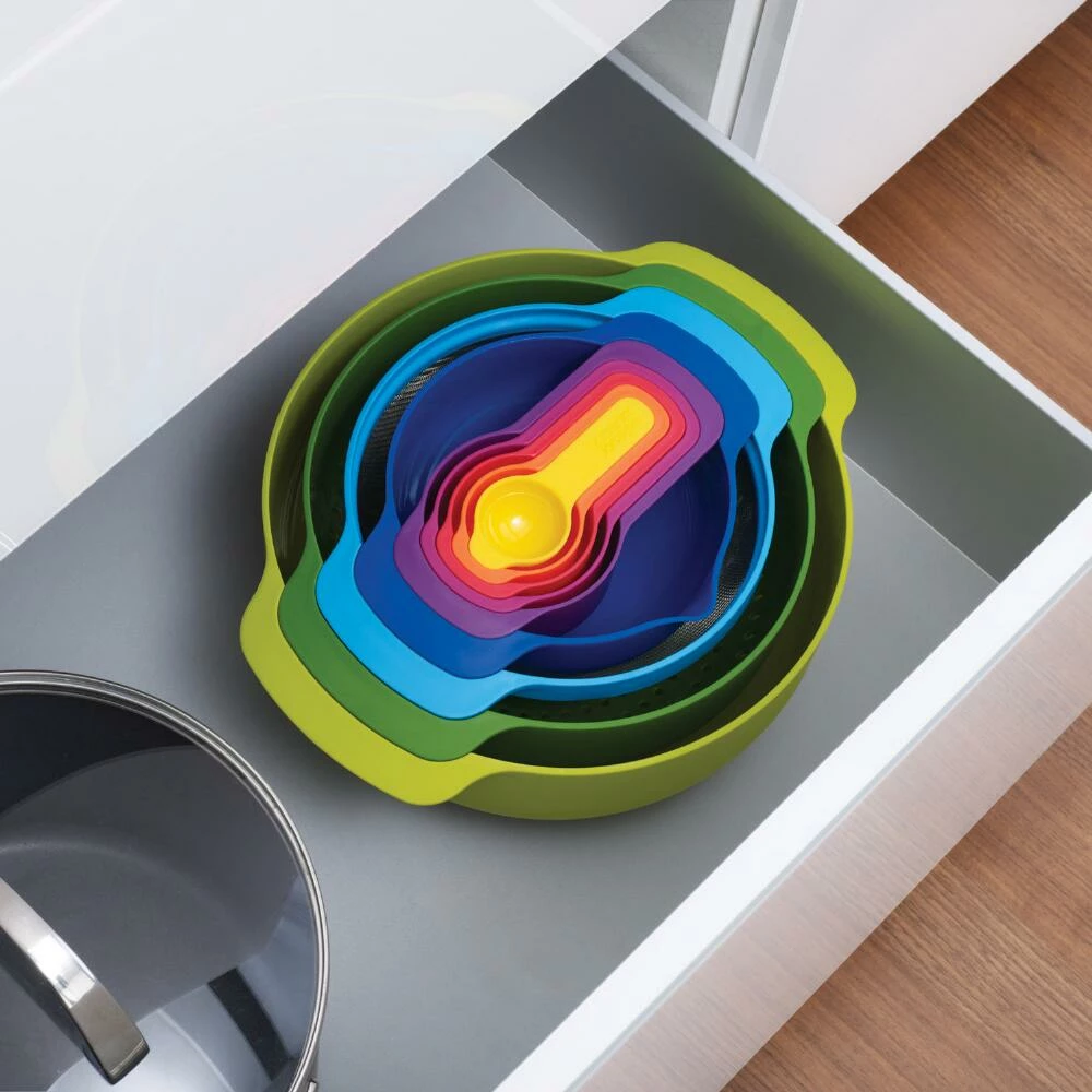 This set of food prep essentials from Joseph Joseph includes two mixing bowls, a colander, sieve and five measuring cups that nest for space-saving storage. These colorful cooking and baking tools are dishwasher safe and durable for long-lasting use. A gift for small kitchens, this prep set is an organized solution to opening a messy cupboard and rustling around for what you need.