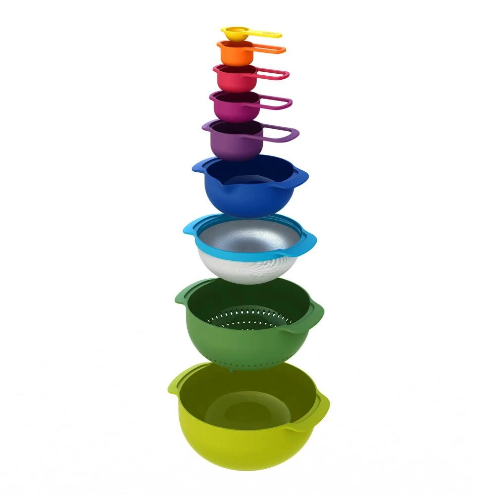 - 9-Piece set includes small and large mixing bowls, sieve, colander and 5 measuring cups in assorted sizes