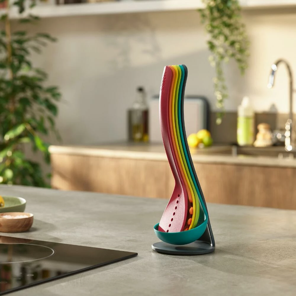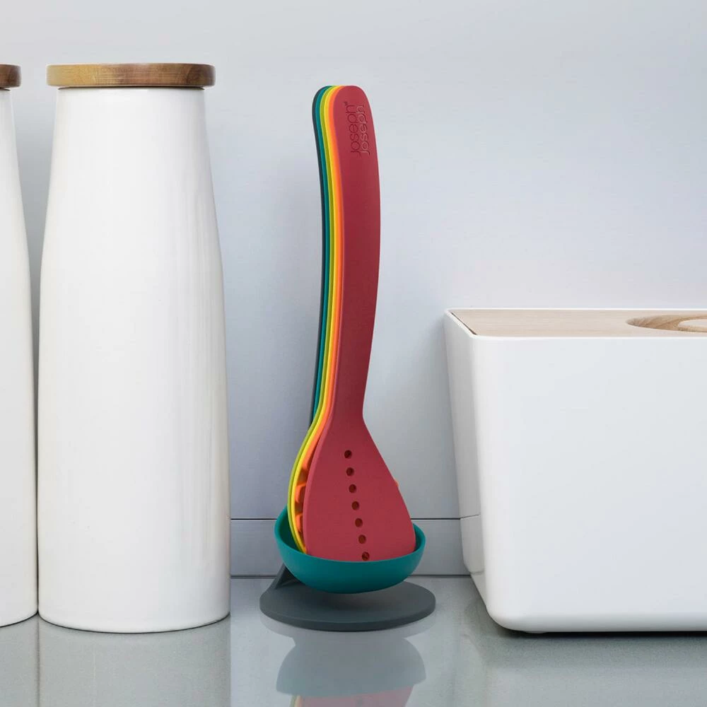 This Joseph Joseph kitchen utensil set includes five cooking and baking tools with magnetic handles that allow them to nest upright in a compact storage stand. The set includes a spatula, slotted and solid spoons, a ladle and a spaghetti server in your choice of chic color-coded shades. Durable and heat-resistant for using with hot pots or pans, when not in use these magnetic kitchen tools will save space with style in small kitchens.