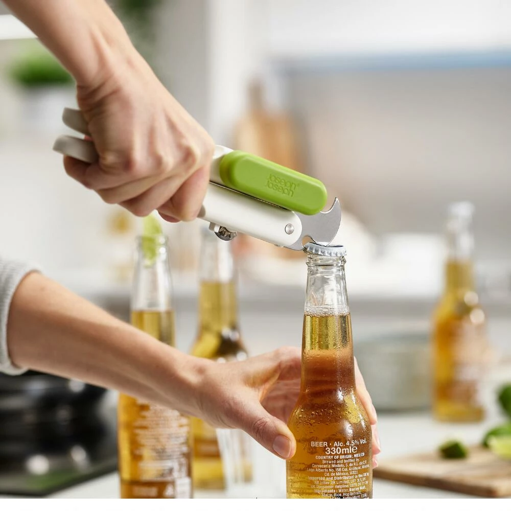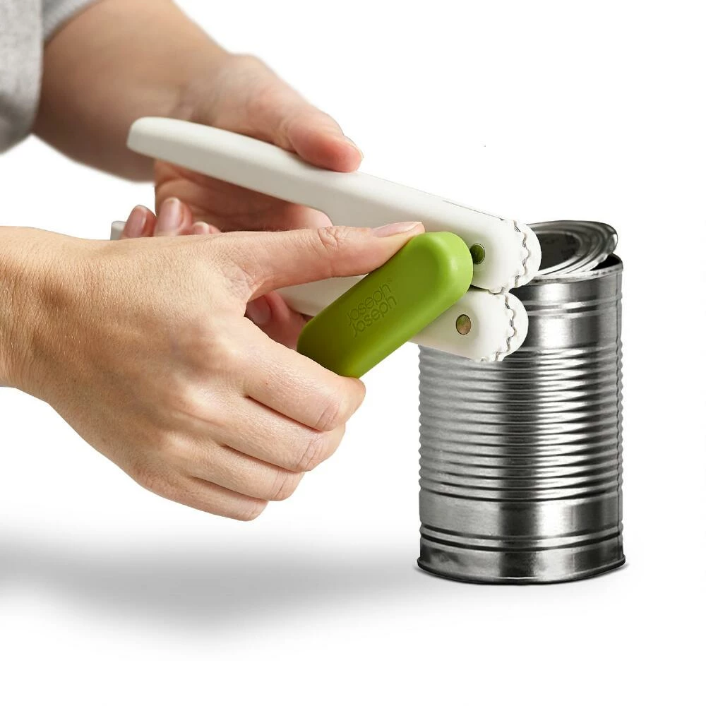 This three-in-one Joseph Joseph can opener features a ring-pull lifter and bottlecap opener in one space-saving design. Opening cans with a sharp stainless-stool cutter, its handles fully rotate to provide access to its other tools. This clever design keeps it sleek for easy storage in small drawers.