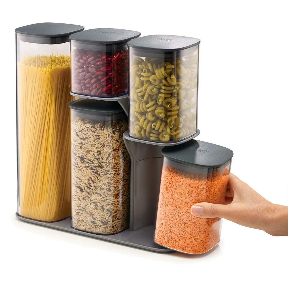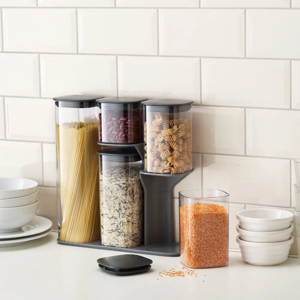 A space-saving pantry organization solution, the lightweight Podium container set is perfect for storing dry foods like pasta, grains, flour and sugar. Featuring air-tight silicone lids and easy-pour corners, this five-piece food storage system is made of clear plastic so you can see what’s inside of each squared container. Each piece tucks neatly into the included stand to maximize your kitchen countertop, shelf, or cabinet space.