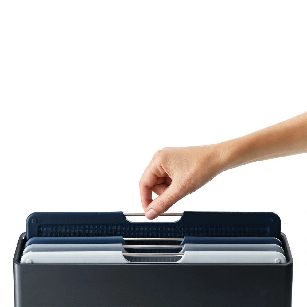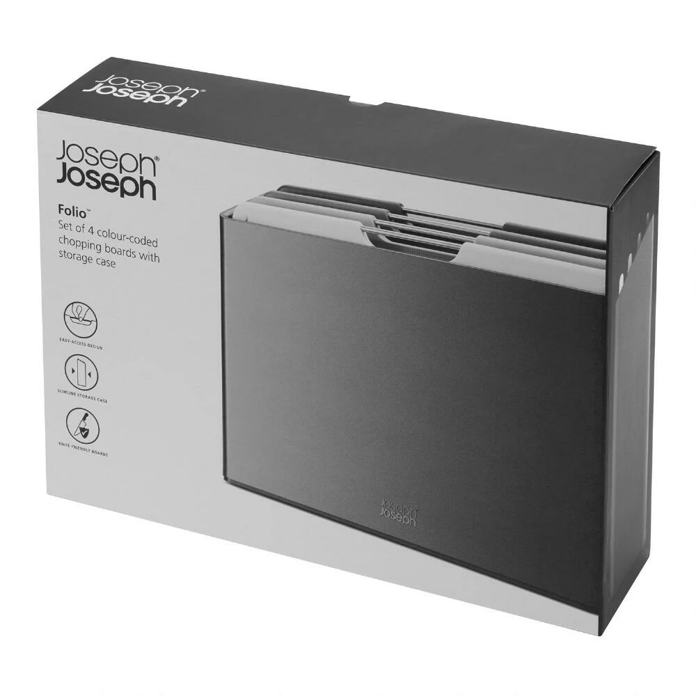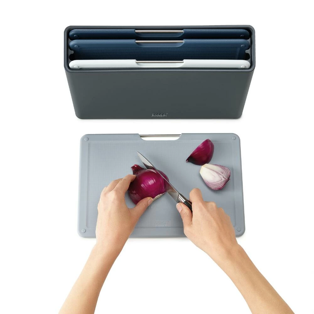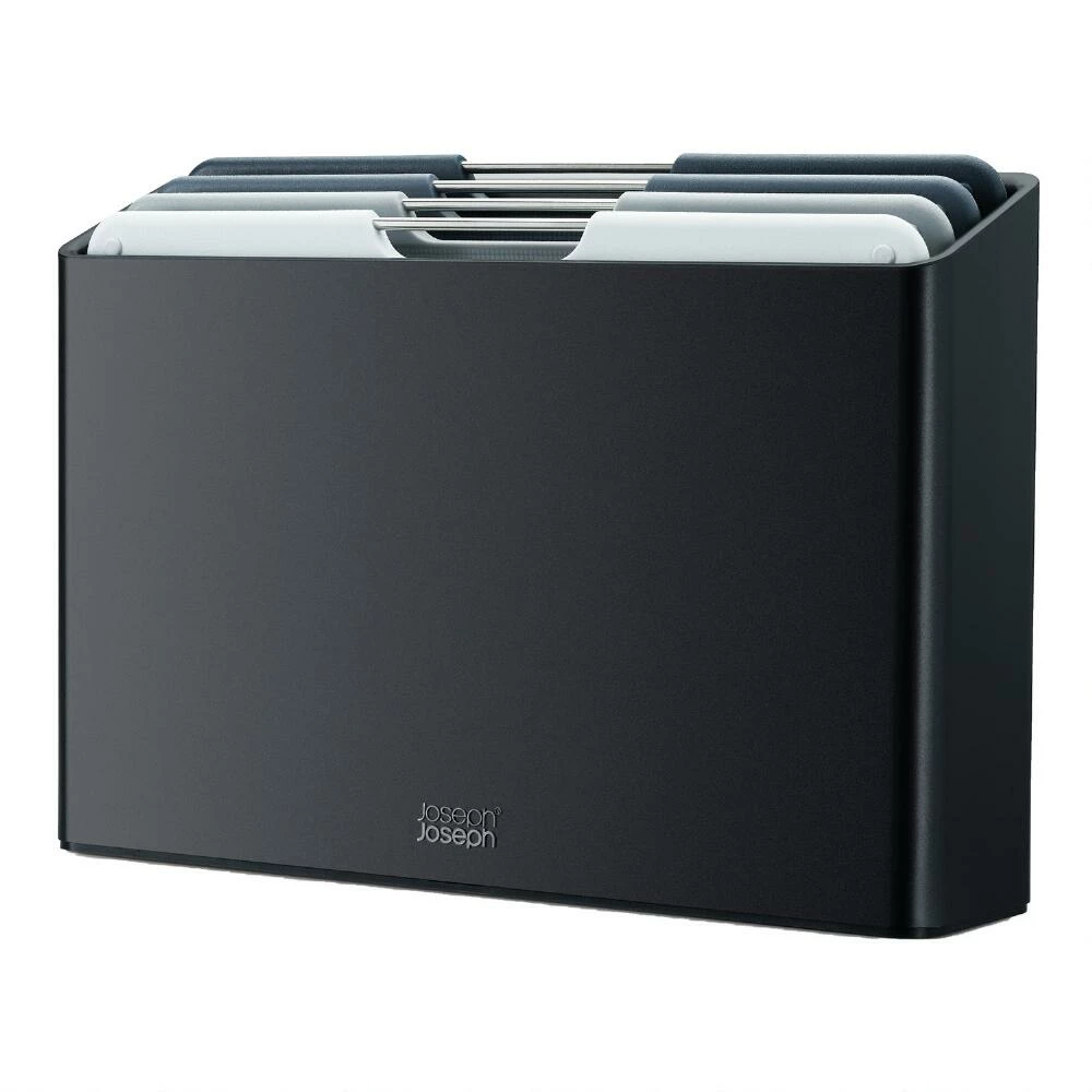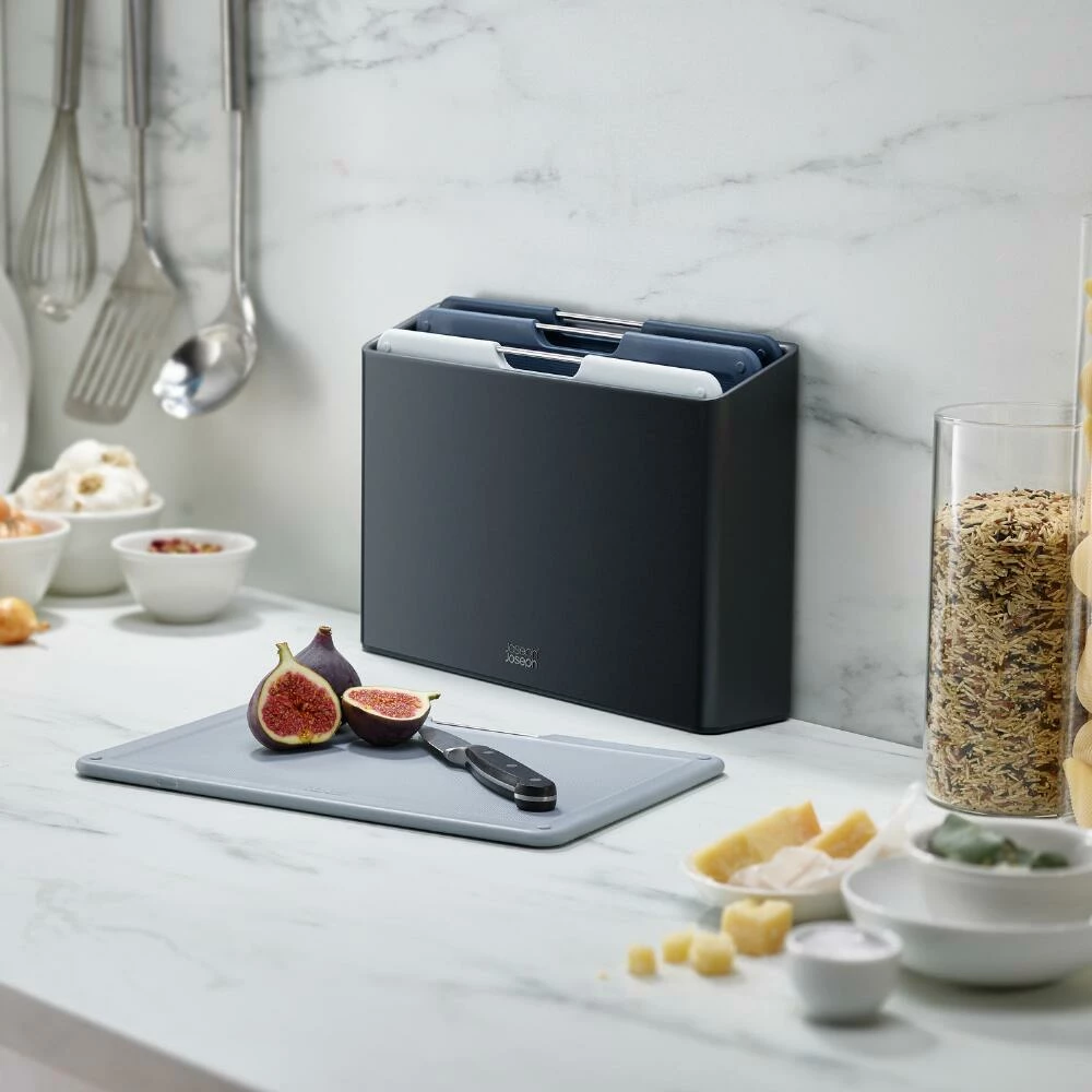 Organizing four shades of chopping boards in a slim graphite-hued storage case, this Joseph Joseph Folio set is a space-saving choice for the kitchen counter. Each durable cutting board is reversible and features a knife-friendly surface, nonslip feet and a stainless-steel bar for easy removal from the folio-style tiered case. London-based Joseph Joseph has won numerous design awards for their innovative kitchenware since 2003.