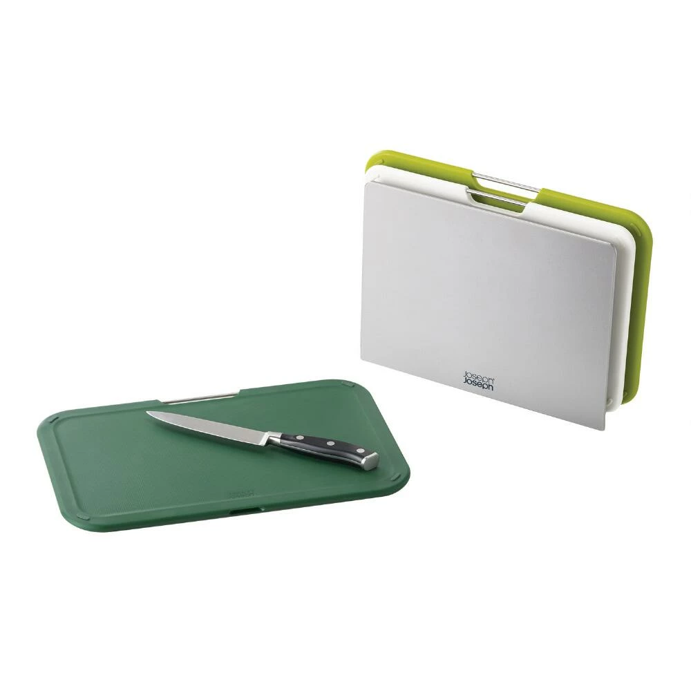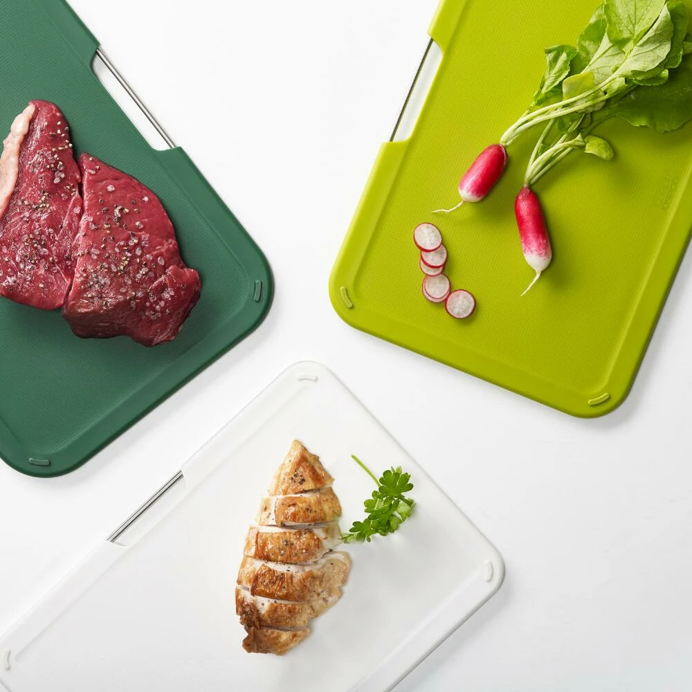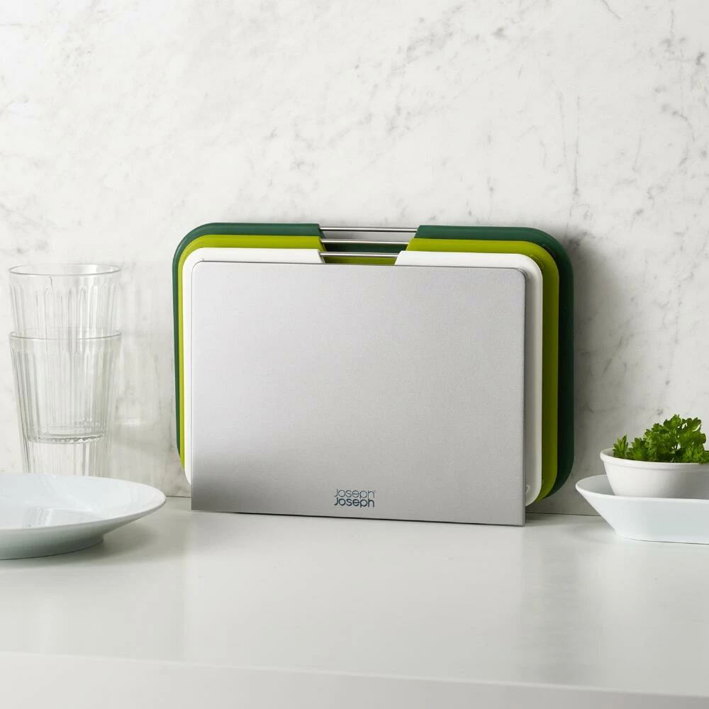 Featuring three large chopping boards that store in a slim vertical stand that allows air to circulate, this Joseph Joseph cutting board set saves space with style. A smart choice for small kitchens available in shades of gray and green, these durable color-coded cutting boards are perfect for food prep with nonslip feet, knife-friendly textured surfaces and stainless-steel bars for easy removal from the sleek stand.