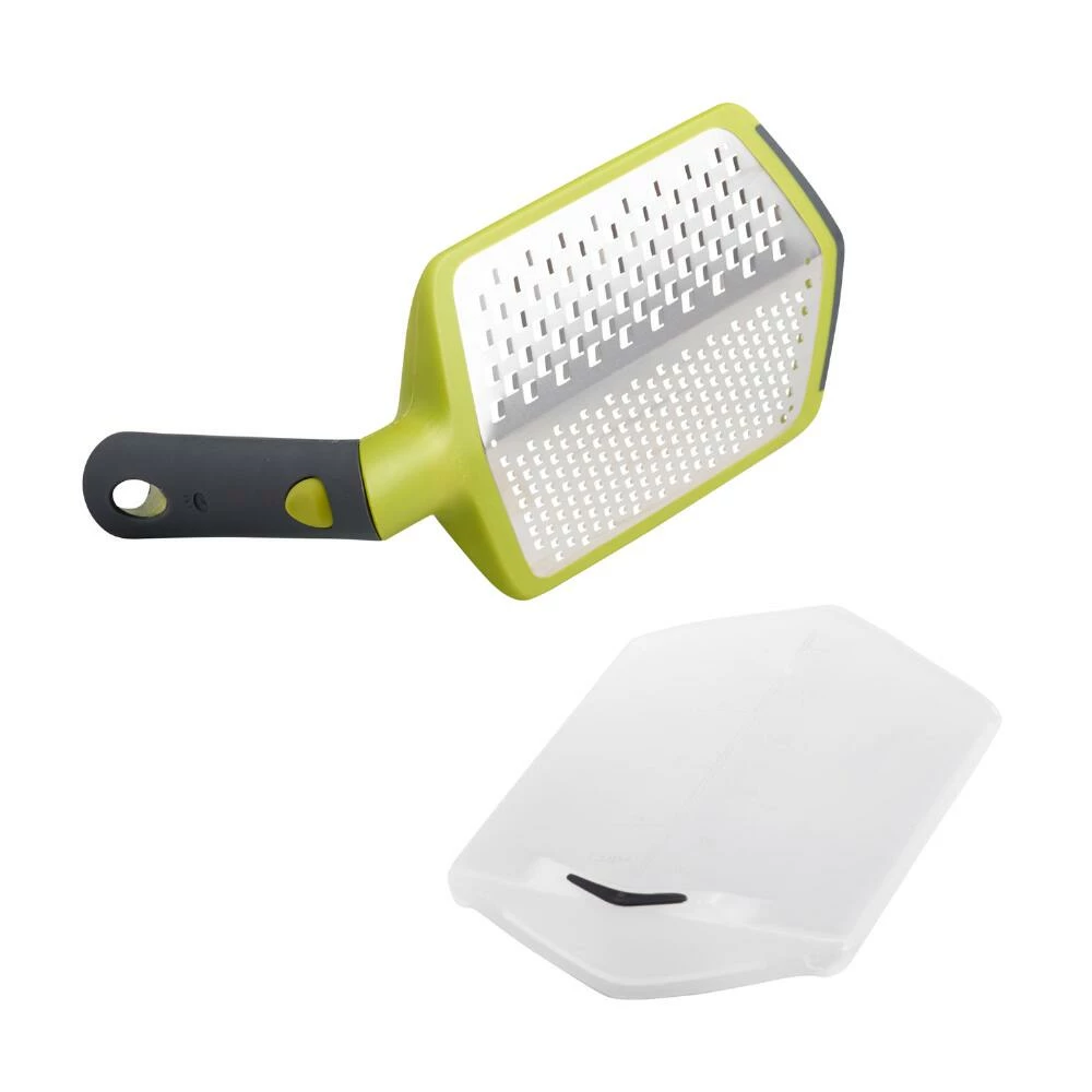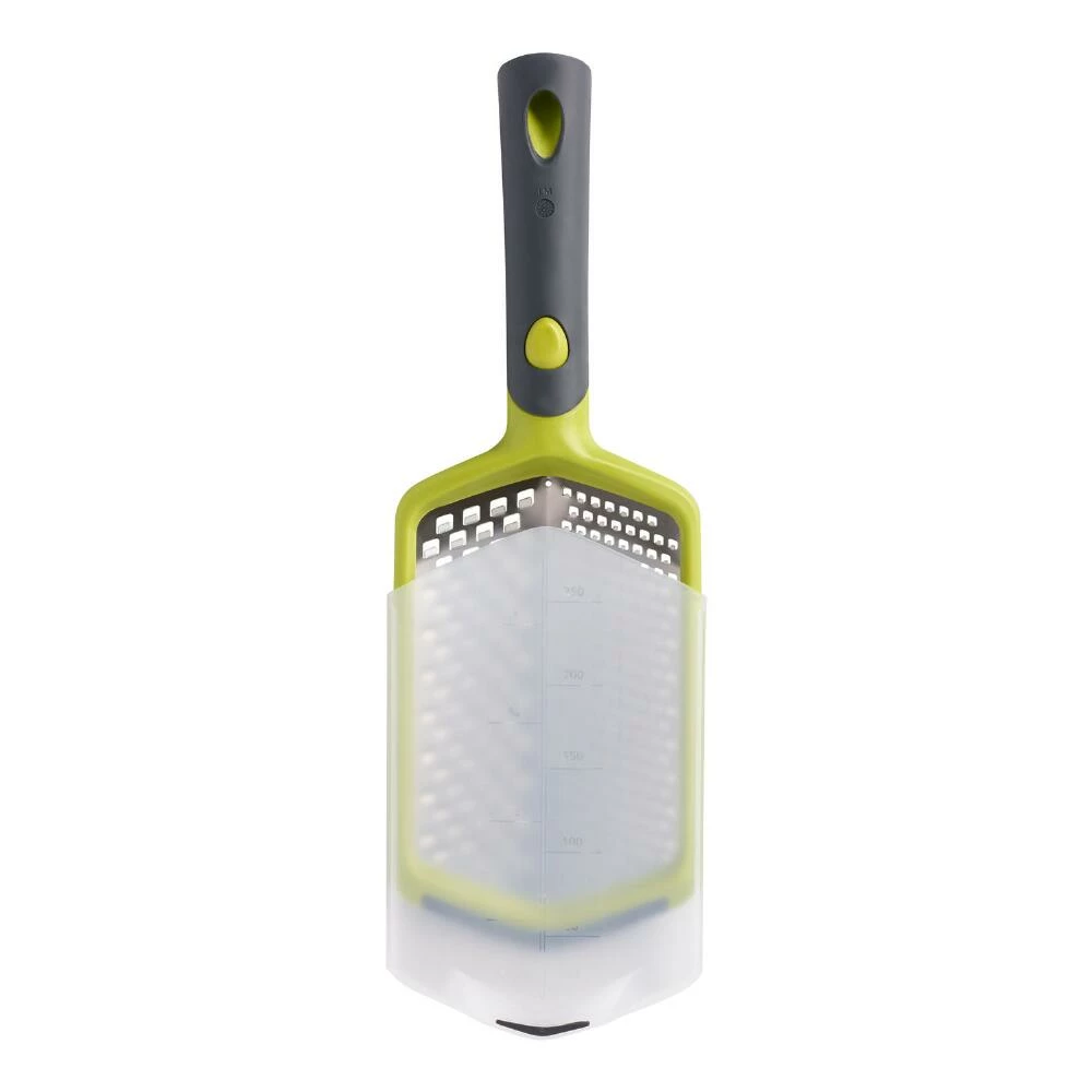 Joseph Joseph’s dual-surface grater features coarse and fine stainless steel surfaces divided down an angled center that makes both sides easy to use. The handle has a twist-and-lock feature that makes it capable of rotating 90-degrees to provide additional leverage for larger grating tasks.