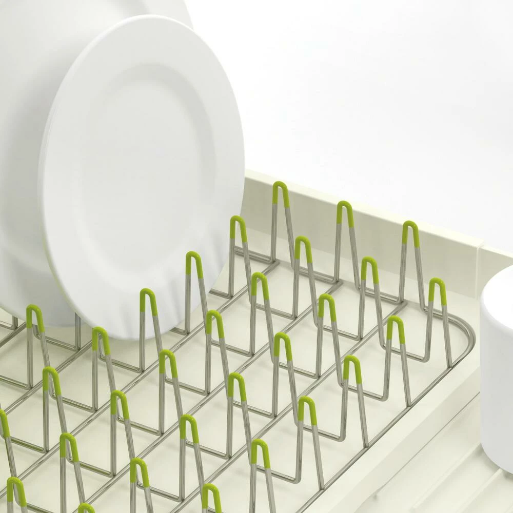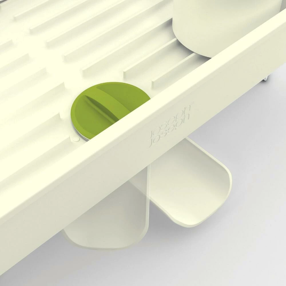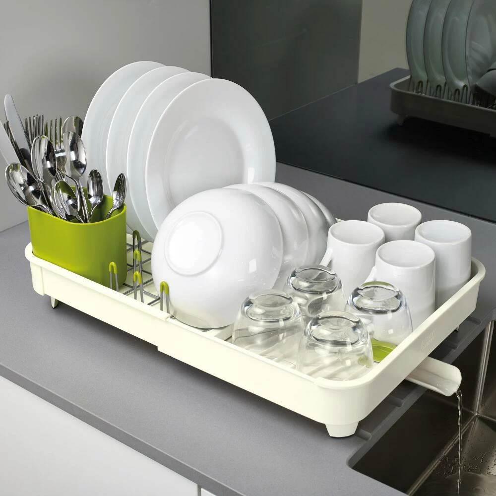 The perfect dish-draining solution for small kitchens, this clever Joseph Joseph dish drainer extends to nearly twice its size on demand. Soft-hued in clean white, this expandable dish dryer features a green adjustable cutlery holder, removable non-scratch drying prongs and a ribbed surface to prevent water from pooling under glassware. Its sloping base directs water to a spout for easy draining whenever you’re ready to pull the plug.