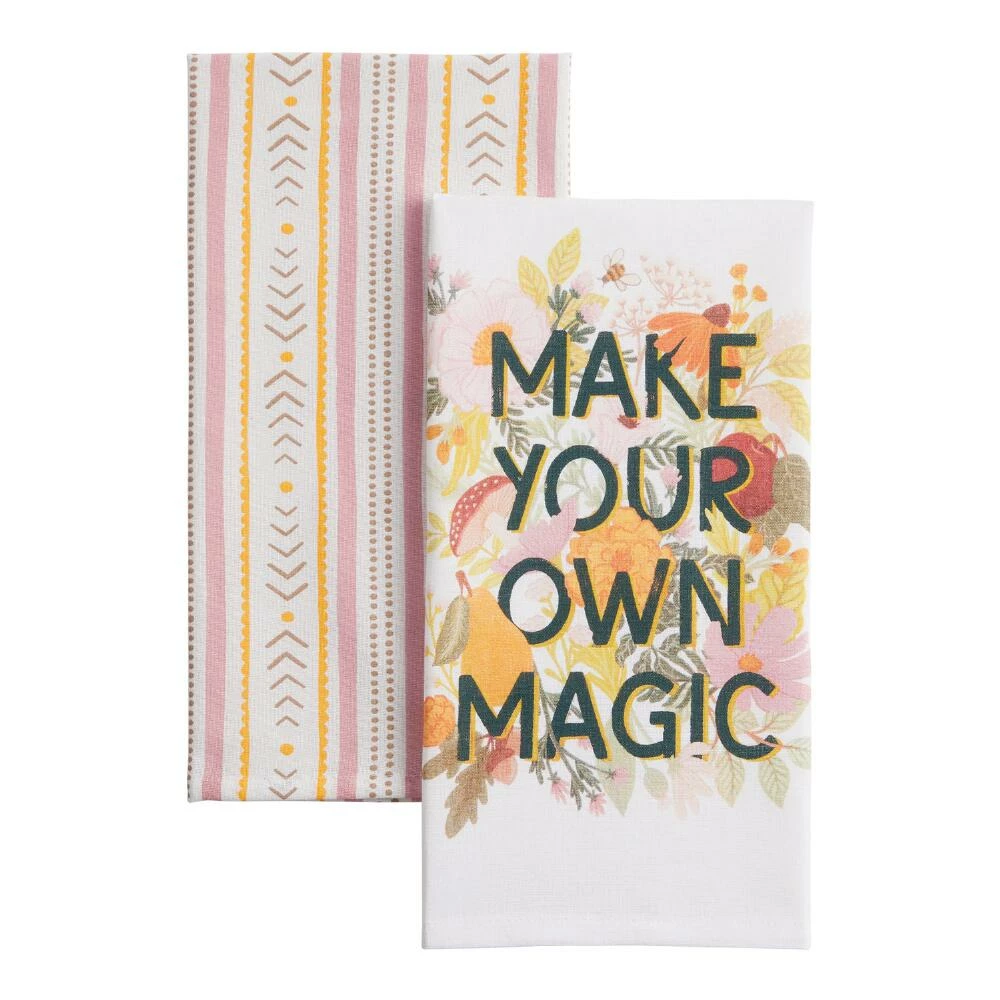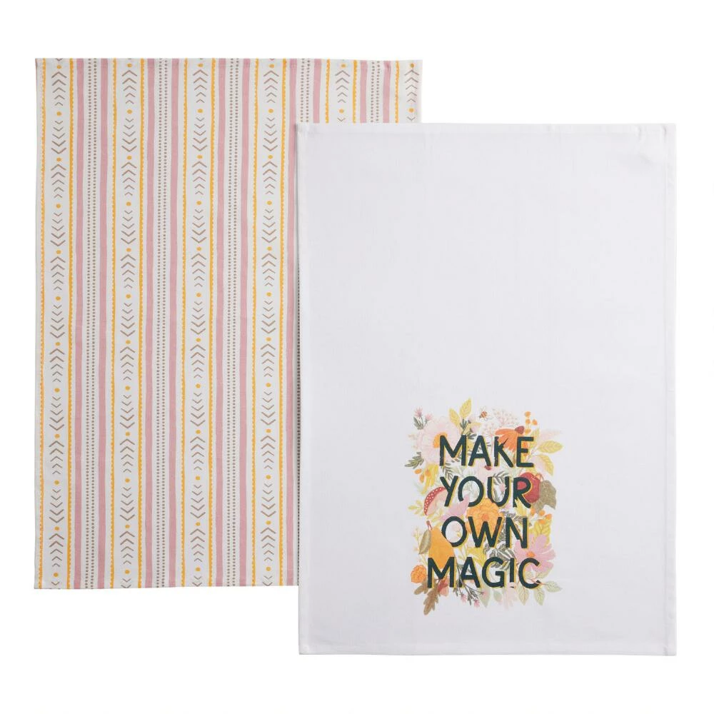 Made of soft cotton for easy cleanup, our kitchen towels add inspiration to your kitchen duties. One is decorated with the words, “Make your own magic” with a coordinating pink and yellow stripe pattern on the other. Whether you’re wiping down counters or drying dishes, this set of absorbent tea towels is a handy addition to your prep space.
