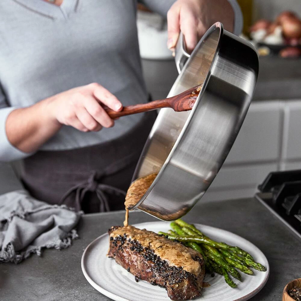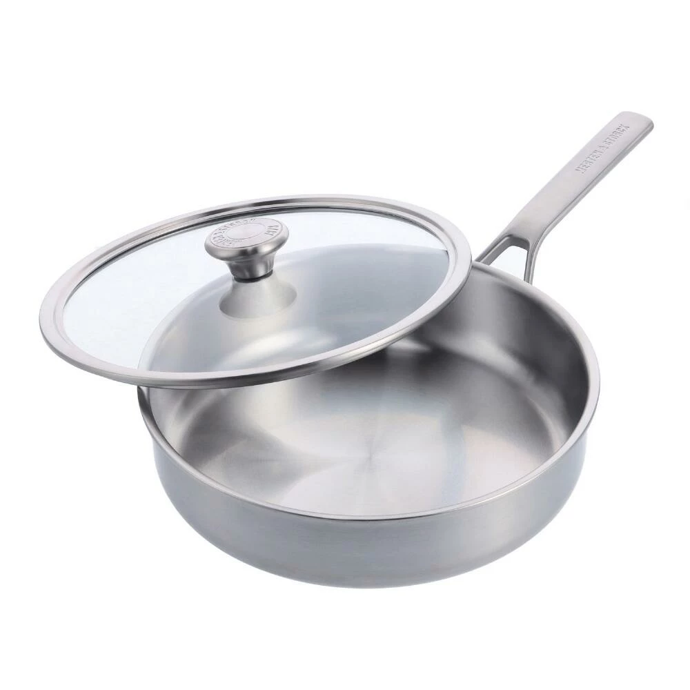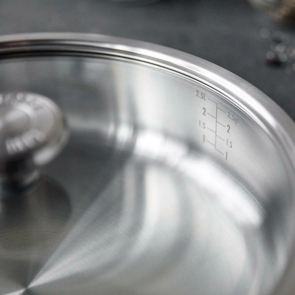 - Made of 3-ply stainless steel with matte finish and glass lid