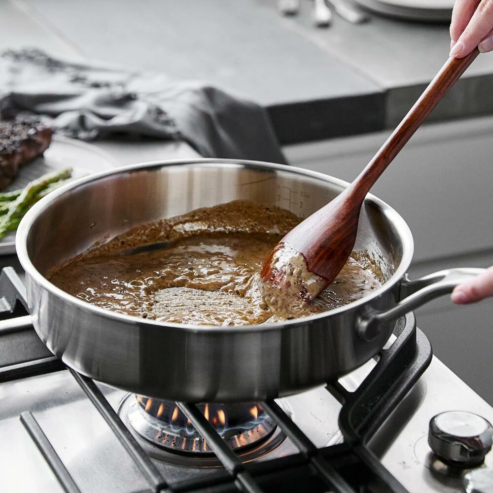 Built of 3-ply stainless steel with a glass lid, this large Merten & Storck saute pan is highly durable and incredibly versatile. Guaranteeing fast and even heat distribution for sauces, soups and full one-pot family meals, it’s also oven-safe for braising and browning. With a beautiful matte finish, this covered saute pan makes high-performance cooking a joy with its snag-free interior, drip-free edges and convenient capacity markings.